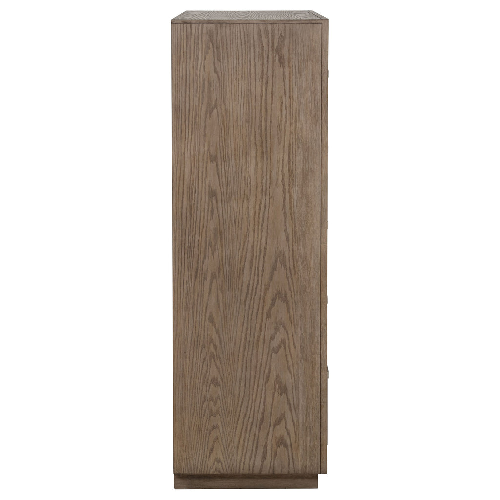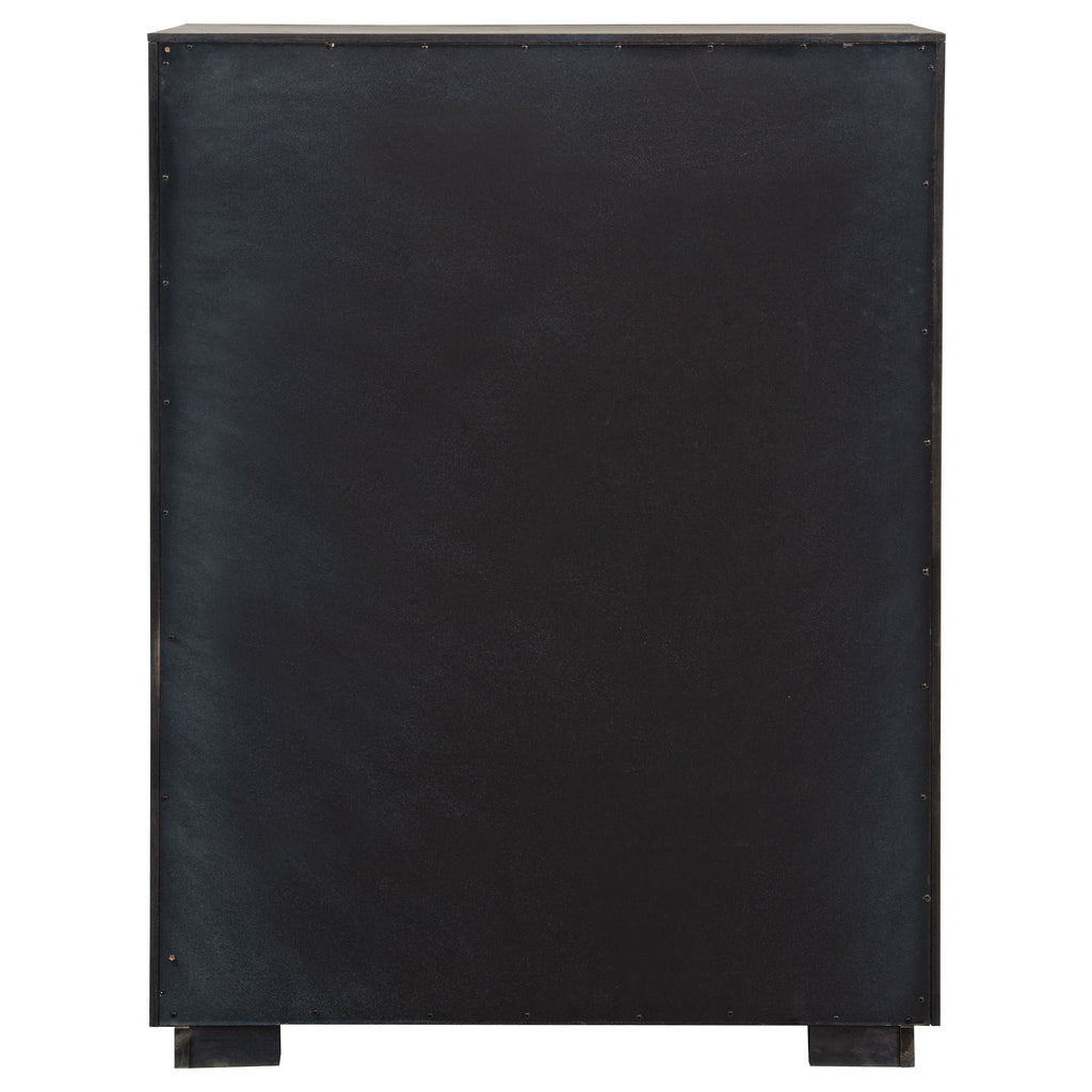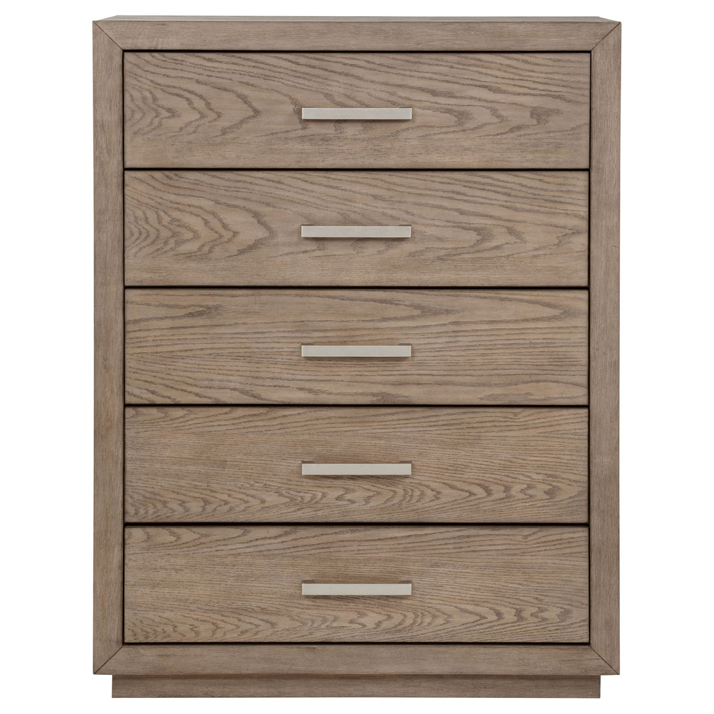 Chrome finish bar pulls add a touch of shine to the neutral barley brown finish of a modern five-drawer chest. Delivering ample storage with a compact footprint, the chest features a streamlined silhouette with mitered trim that creates a sense of depth. The top provides an easy spot for decor or a jewelry box that brings a personal touch. The soft wood grain finish of the chest complements in a variety of bedroom settings, making this a versatile choice for your home. The look is complete with a recessed base that provides a touch of height and airy presence.