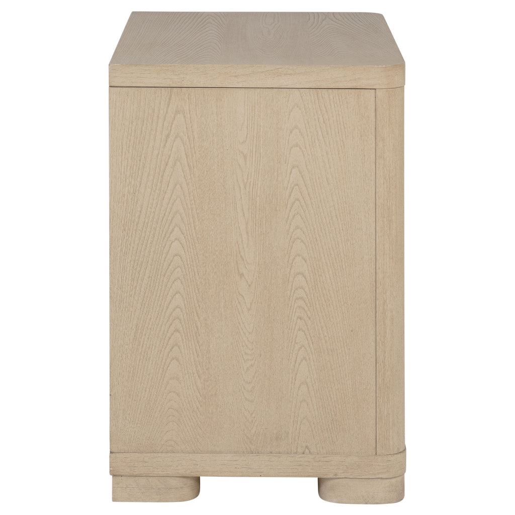 Blending sleek design with practical functionality, this nightstand features a light elm finish and brushed nickel fingertip pulls for a subtle sparkle. Rounded corners enhance its modern appeal, while two extra-large drawers offer ample space for bedside essentials. The top drawer, lined with gray felt, adds a touch of elegance. Cord management access provides convenience, making this piece perfect for modern living.