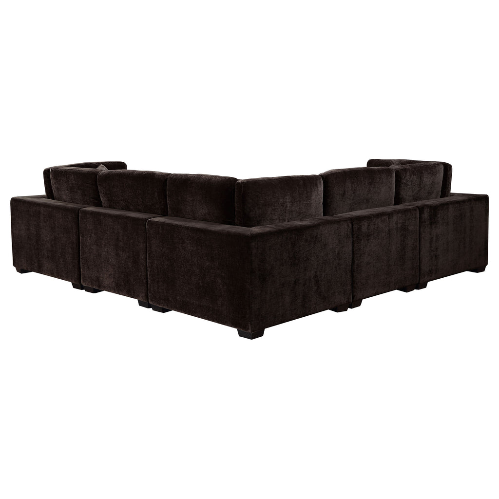 Plush cushions and streamlined design bring appealing flair to a modern modular sectional sofa. This design includes an ottoman that creates a stylish chaise or takes the place of a coffee table, offering a plush, cozy ambiance in your living room. It boasts soft, inviting upholstery in a neutral hue, setting the tone for a stylish living space. Smooth cushions creates exceptional comfort, while understated track arms ensure a clean-lined silhouette. This sectional is the perfect solution in a family space built for inviting comfort.