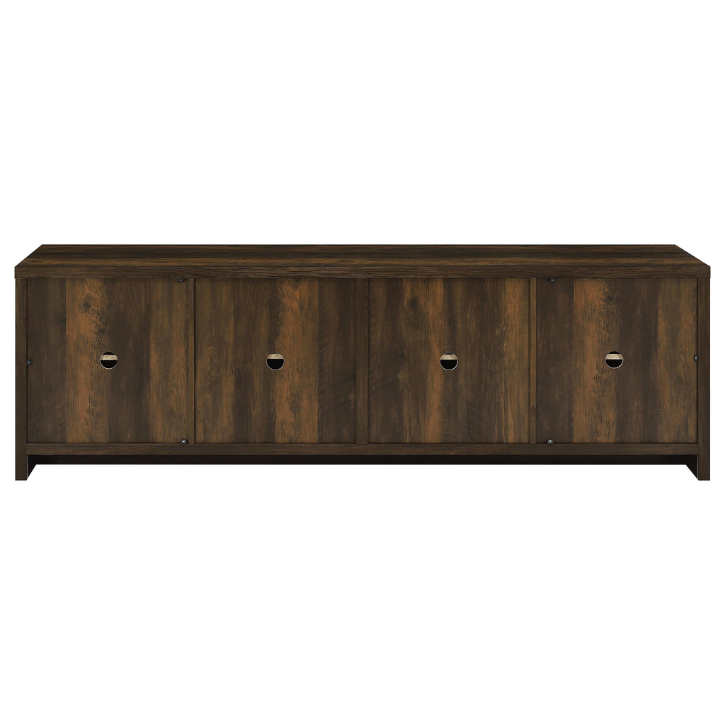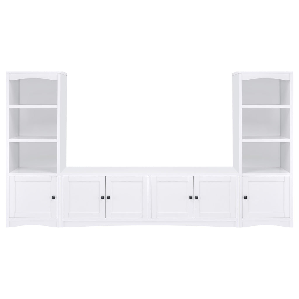 Transform your living space with this beautifully crafted entertainment center, designed to combine style and functionality for your media needs. Anchored by a 78-inch TV stand, this set is perfect for hosting up to an 85-inch television, offering a spacious and organized solution for your home. The TV stand features four doors that open to adjustable shelves, complete with cord management openings, making it easy to keep your media and gaming components neatly arranged. Flanked by two matching media towers, the entertainment center provides additional storage and display options with a mix of open shelving and concealed cabinet space. Finished in a warm, neutral tone, this entertainment center blends seamlessly with any decor, creating an inviting focal point in your living room.