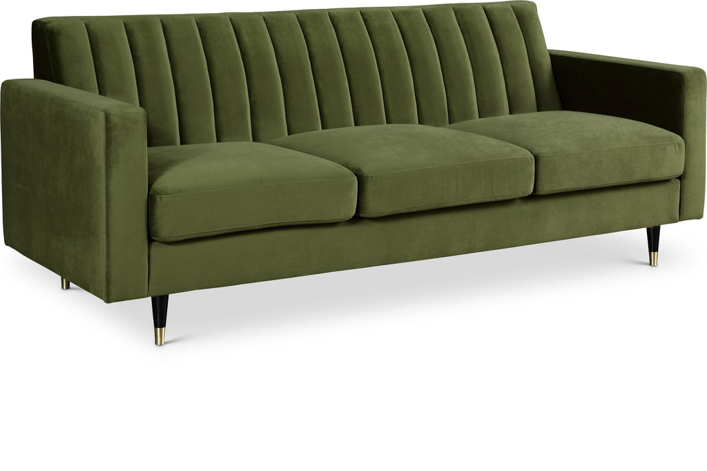 Cozy up to the comfort of this Lola Olive Green Velvet Sofa. Its rich color adds a jolt of excitement and fun to your space, shaking things up in a neutral-colored room. The back is channel tufted for a beautiful, contemporary look and to help the back cushioning maintain its welcoming loft. Elegant slant-tipped black legs with gold tips lend this sofa a charmingly modern finish and provide a sturdy foundation. Add it on its own, or add the matching loveseat and chair for a coordinated look.