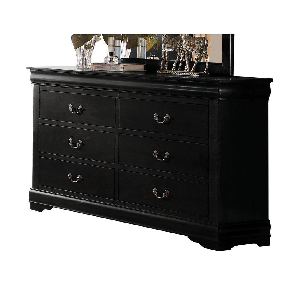 ACME Louis Philippe Dresser, Black, 57" x 15" x 33"H, 82Lbs. The Louis Philippe Dresser in black finish is constructed of solid wood in finish options for customization. It features six drawers with metal drop handle pulls, perfect for storing clothing and bedding. Add the optional mirror to create a complete set Materials: Wood, Wood Veneer, Composite Wood
