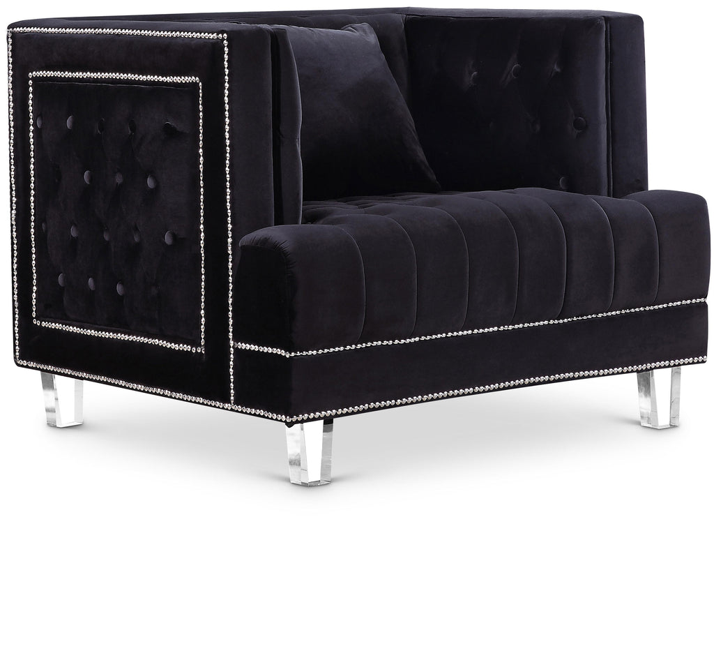 The Lucas Collection by Meridian Furniture. Features beautifully tufted velvet upholstery with a custom nail head design and clear acrylic legs. This collection is guaranteed to be the highlight of any home.