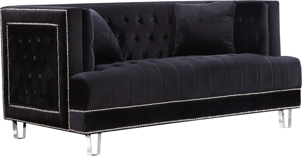 The Lucas Collection by Meridian Furniture. Features beautifully tufted velvet upholstery with a custom nail head design and clear acrylic legs. This collection is guaranteed to be the highlight of any home.