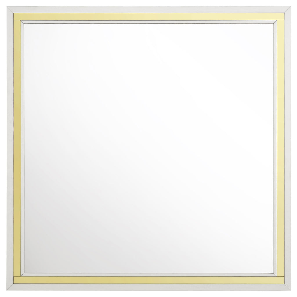 Effortlessly blending inviting softness and timeless sophistication, this four-piece modern bedroom set creates a rich but inviting ambiance. It centers on a stylish upholstered bed that pairs beige upholstery with a fluted look, creating impressive texture and dimensionality. Its on-trend silhouette encourages an open, airy feeling, complete with understated rails and footboard. The set includes a two-drawer nightstand and six-drawer dresser and mirror combination, creating a stylish set that brims with elegance. The cases features a bright white finish, while each piece is trimmed in gold, offering gleaming warmth and sophistication.