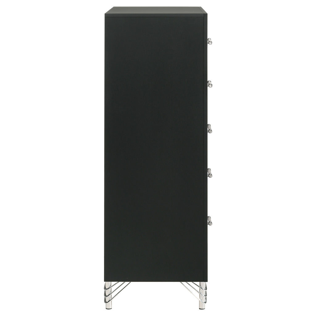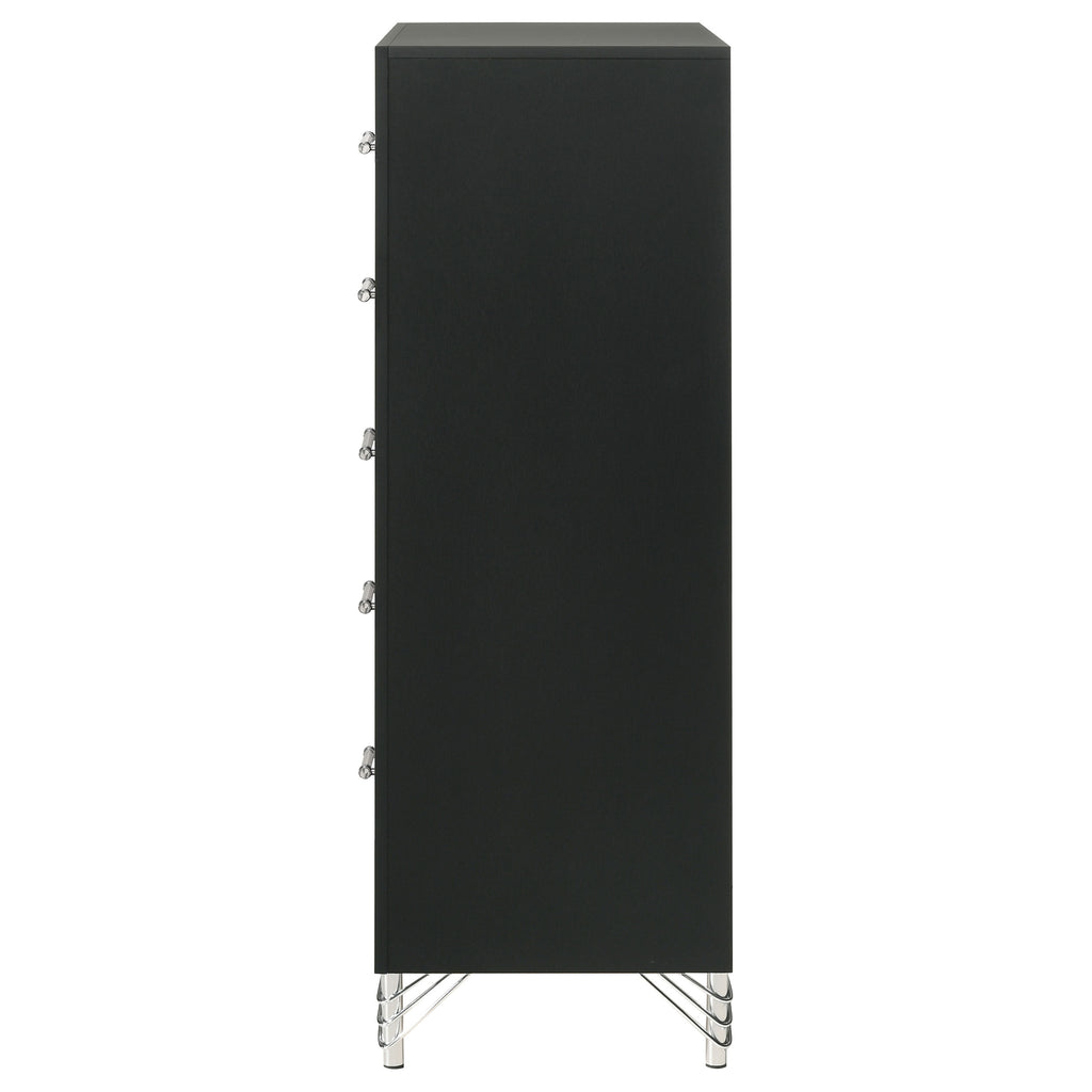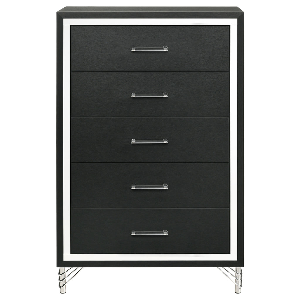 Inspired vintage touches create a refined sensibility for a modern five-drawer chest. Its tall, compact profile is ideal for a dressing area, offering plenty of storage with five roomy drawers that host everything from clothing and accessories to linens and other personal effects. The chest shows off a bright white finish, complete with gleaming gold trim that adds warmth and elegance. Its long bar drawer pulls add character, while hair pin inspired legs bring retro glamour and sophistication. Add decor to the top for a personal touch in your bedroom.