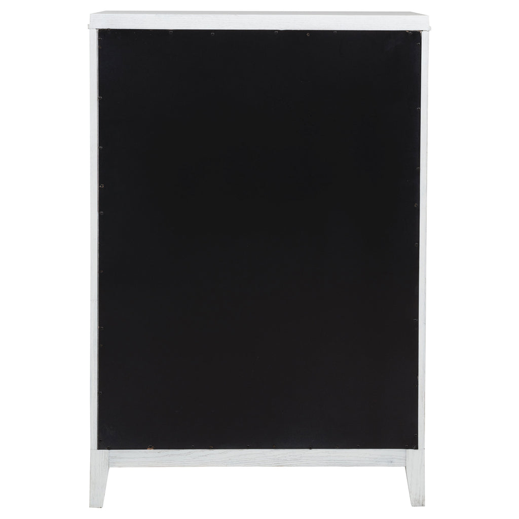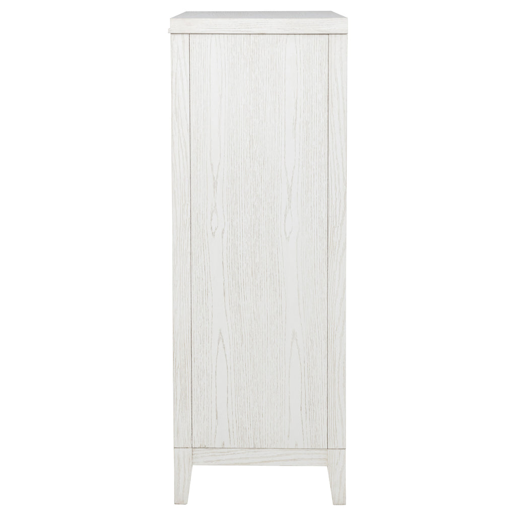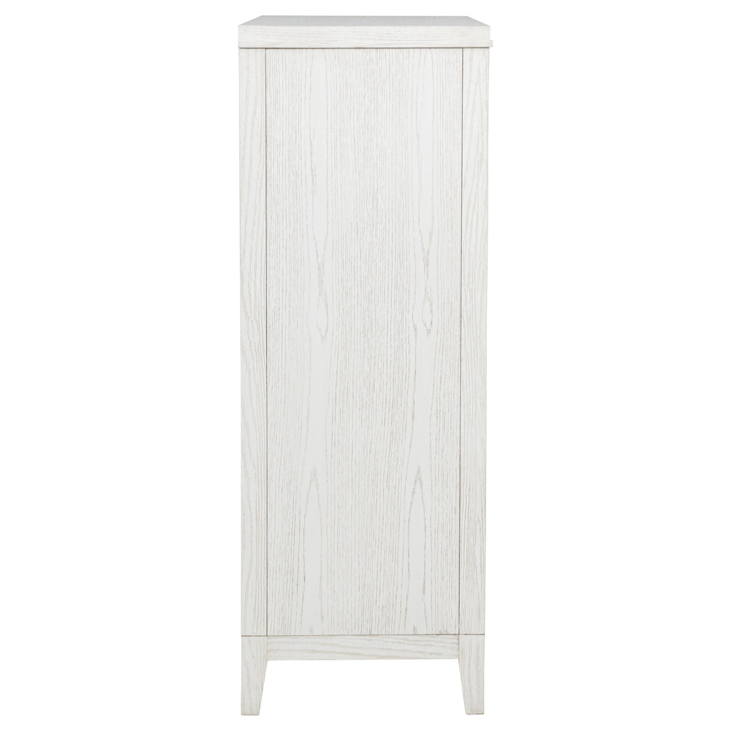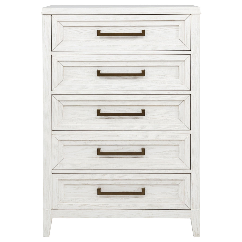 Add easy storage and inviting style to your bedroom with a modern five-drawer chest. It's tall, compact silhouette conserves space while adding welcome storage and organization. The chest features a distressed white finish to highlight wood grain details for a fresh, organic effect in your bedroom. Antique brass-toned bar pulls add contrast and definition on trimmed drawer fronts, creating inviting texture and depth. Tapered legs finish off this inviting look and a tip over restraint is included for added safety.