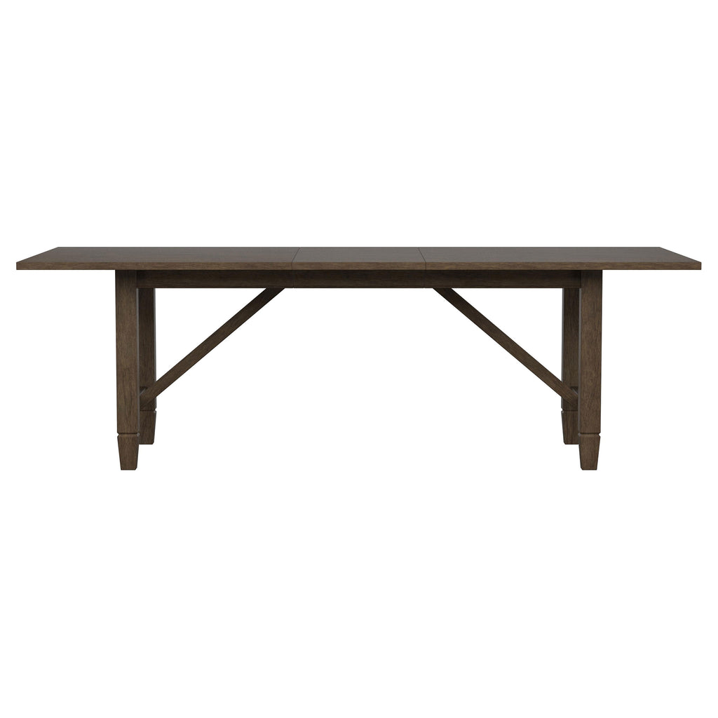 Introduce easy, inviting style with a seven-piece transitional dining set. Creating a perfect spot for family meals or entertaining, the set features a rectangular table crafted in Asian hardwoods that features an 18-inch extension leaf that offers additional seating for friends and family. A light neutral brown wood finish is perfect for a variety of kitchen and dining room settings, perfectly achieving a warm, inviting ambiance. Chairs are designed with airy rattan backs that add wonderful texture and dimension, while padded seats and beige upholstery are comfortable and stylish. The table adds trestle-inspired angular supports for a touch of compelling character.