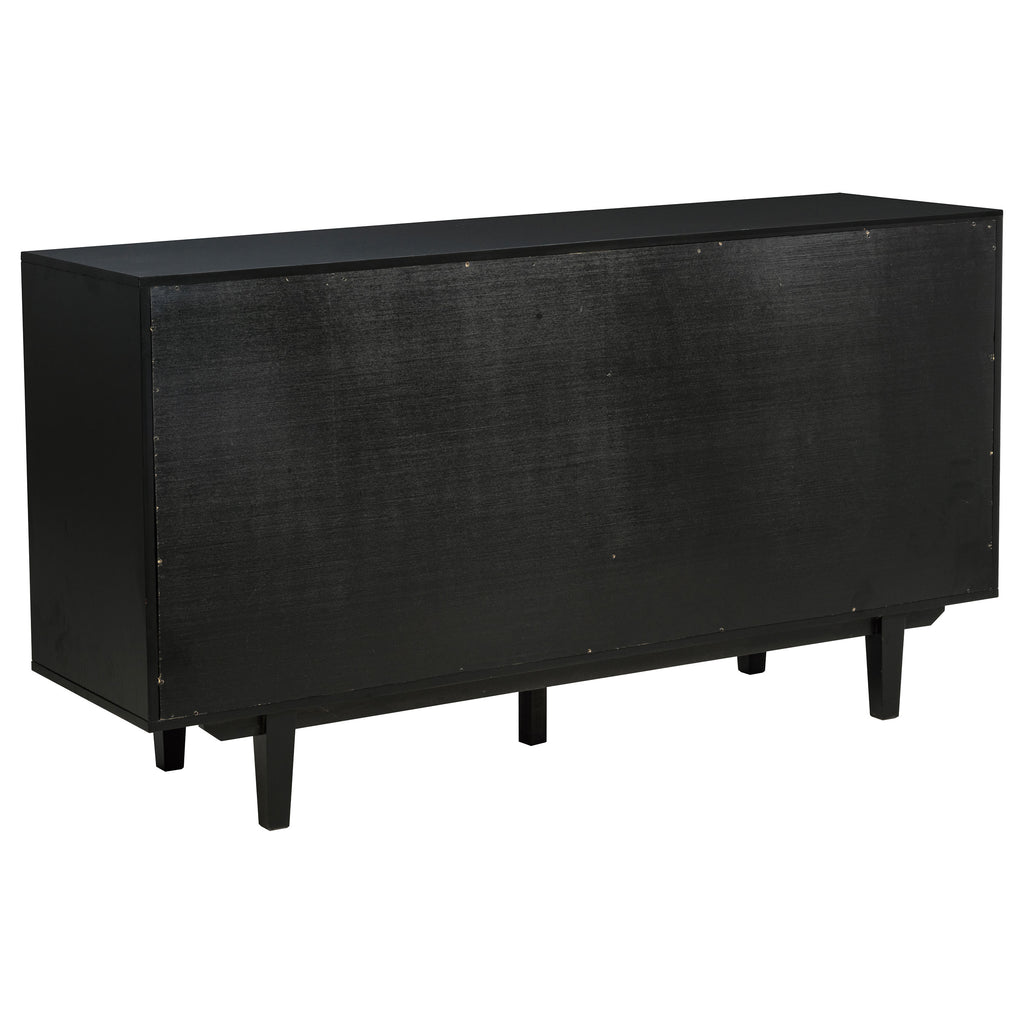 This versatile sideboard combines modern elegance with functional design. It features tempered glass-paneled cabinet doors that reveal adjustable shelving, perfect for displaying or organizing items. Two smooth-gliding, felt-lined drawers offer concealed storage for delicate essentials. Crafted from durable mahogany, engineered wood, and ash veneer, this piece is supported by sturdy tapered legs, ensuring lasting stability and style. Ideal for dining, living room, or multipurpose storage needs.