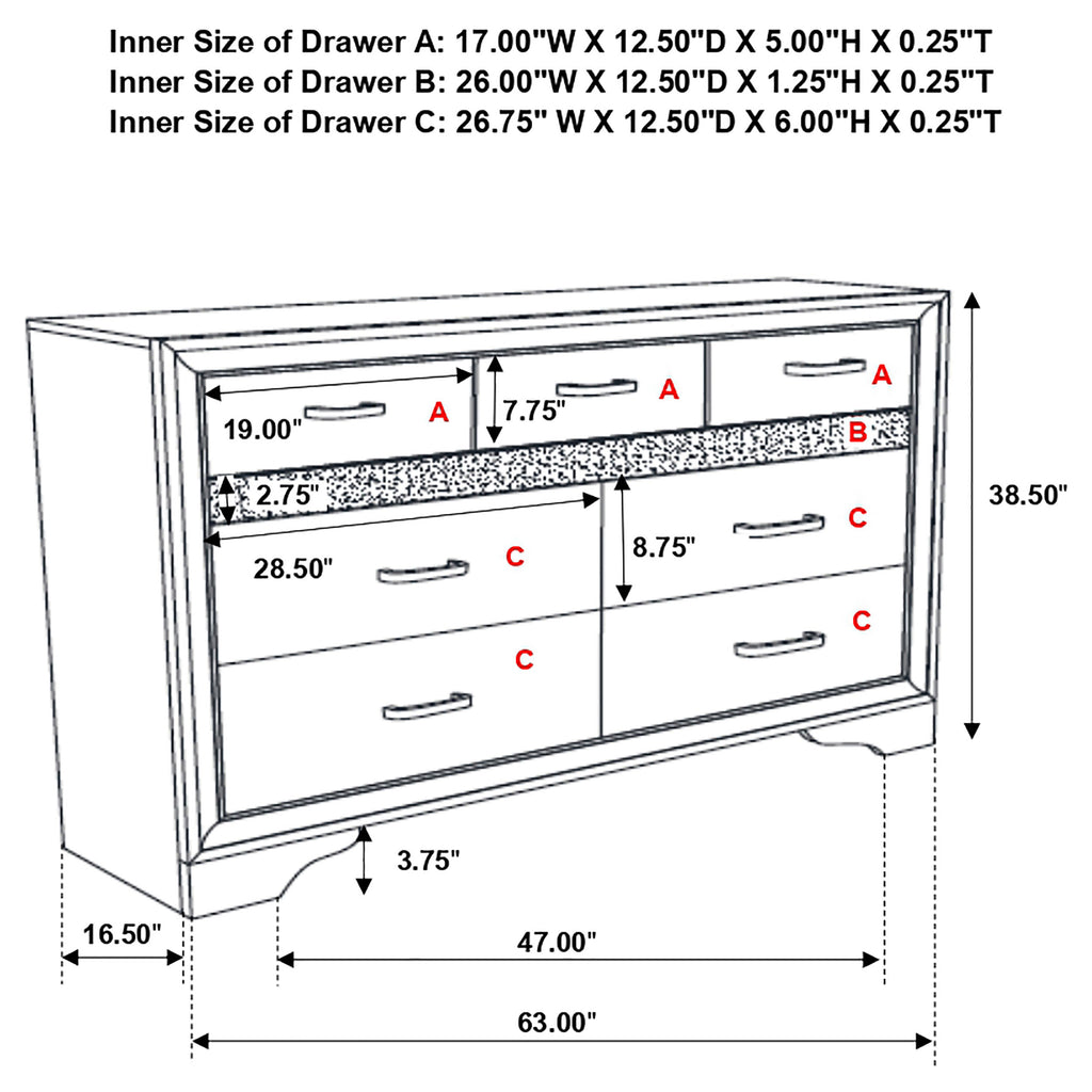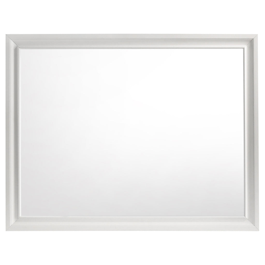 Encourage a glam vibe in your refined bedroom with a modern four-piece bedroom set. Centering on a stylish bed with an upholstered headboard and low footboard, the set includes a two-drawer nightstand for easy bedside storage and display space. A seven drawer dresser and mirror complete the set, adding diamond-like trim across its face that catches the light and offers a sophisticated touch. Bracket feet add a touch of dimensionality and movement to each piece and jewel-like bar pulls add intriguing sparkle. A cool white finish is textured, while white finish trim is smooth, creating a touch of textural contrast that add engaging style.