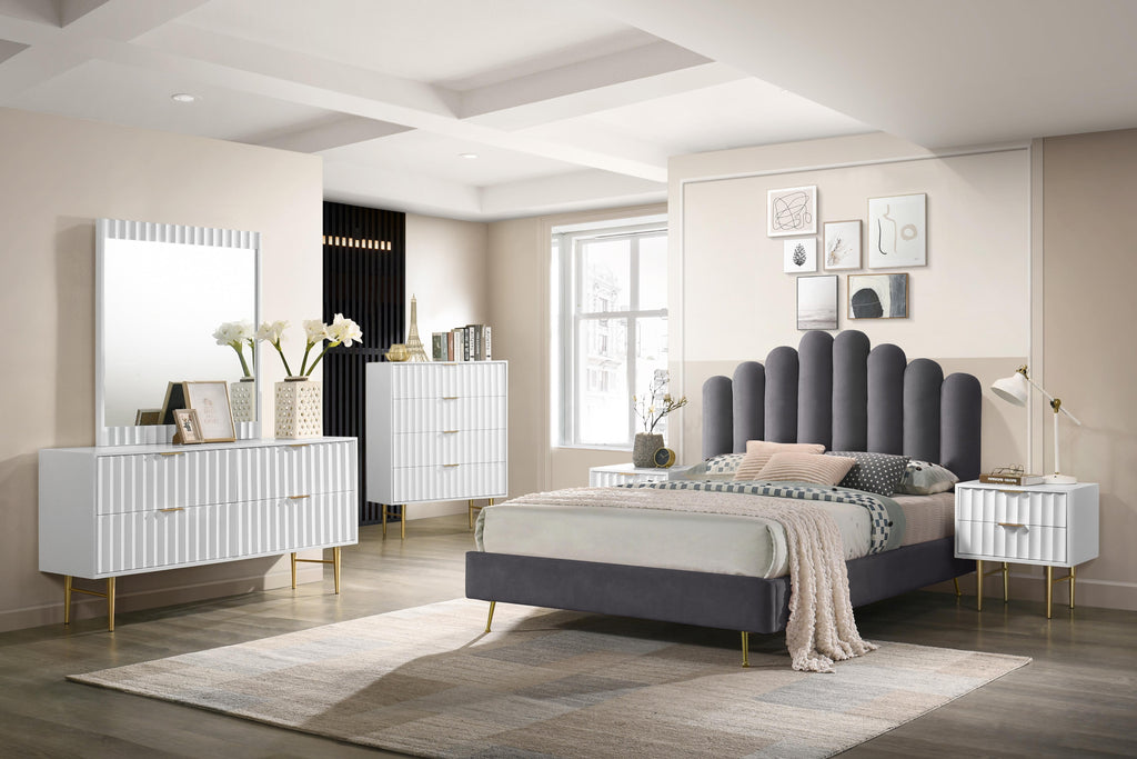 Embody industrialist style with this Modernist mirror in a white medium gloss finish. Utilitarian but sculptural in design, this piece features a ridged, textured look that is chic but sleek. It rests on brushed gold steel legs and has gold brushed handles for a bit of regality. Combine this piece with other items in the Modernist lineup for a cohesive finish to your room makeover.