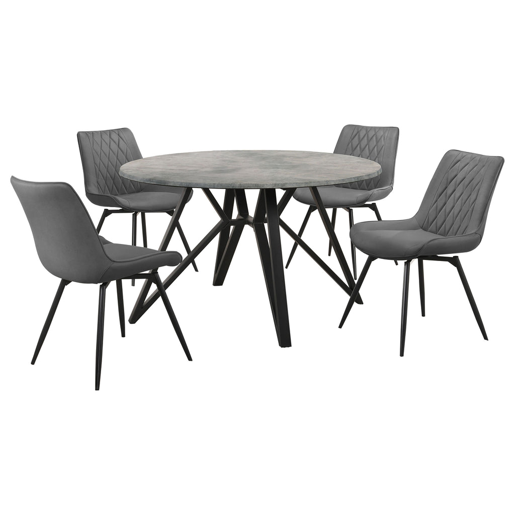 Return to a retro vibe in your casual dining space, adding this five-piece dining set to bring a soft, light feel. A round dining table anchors this tasteful set, featuring a gray faux marble top and a stylish geometric gunmetal finish iron base with hairpin-inspired legs. Side chairs are as comfy as can be with a gently angled seat back and foam-padded seat, all upholstered with soft gray fabric and dressed up with quilting detail. Swivel mechanisms add convenience to each chair, and retro-like round, tapered legs ups the ante on attitude. Set includes one dining table and four side chairs.