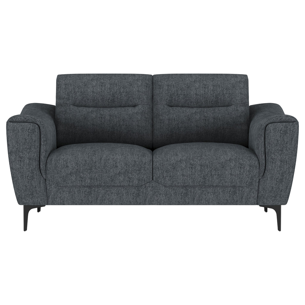 Indulge in effortless style and comfort with this chic transitional sofa set. Soft charcoal upholstery gracefully harmonizes with any décor, while plush pocket coil seat cushions and modern track arms provide inviting support for your downtime. Designed with attached cushions for a neat appearance and innovative metal legs that allow for easy assembly, this collection elevates the overall ambiance of your living space.