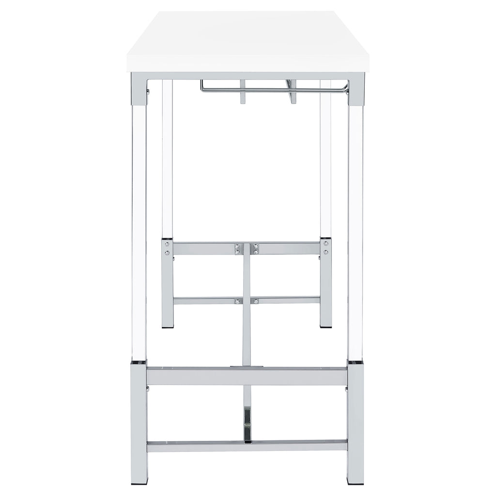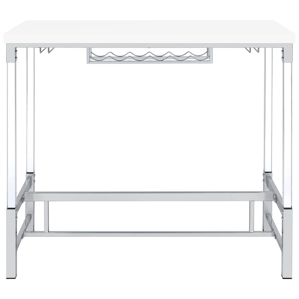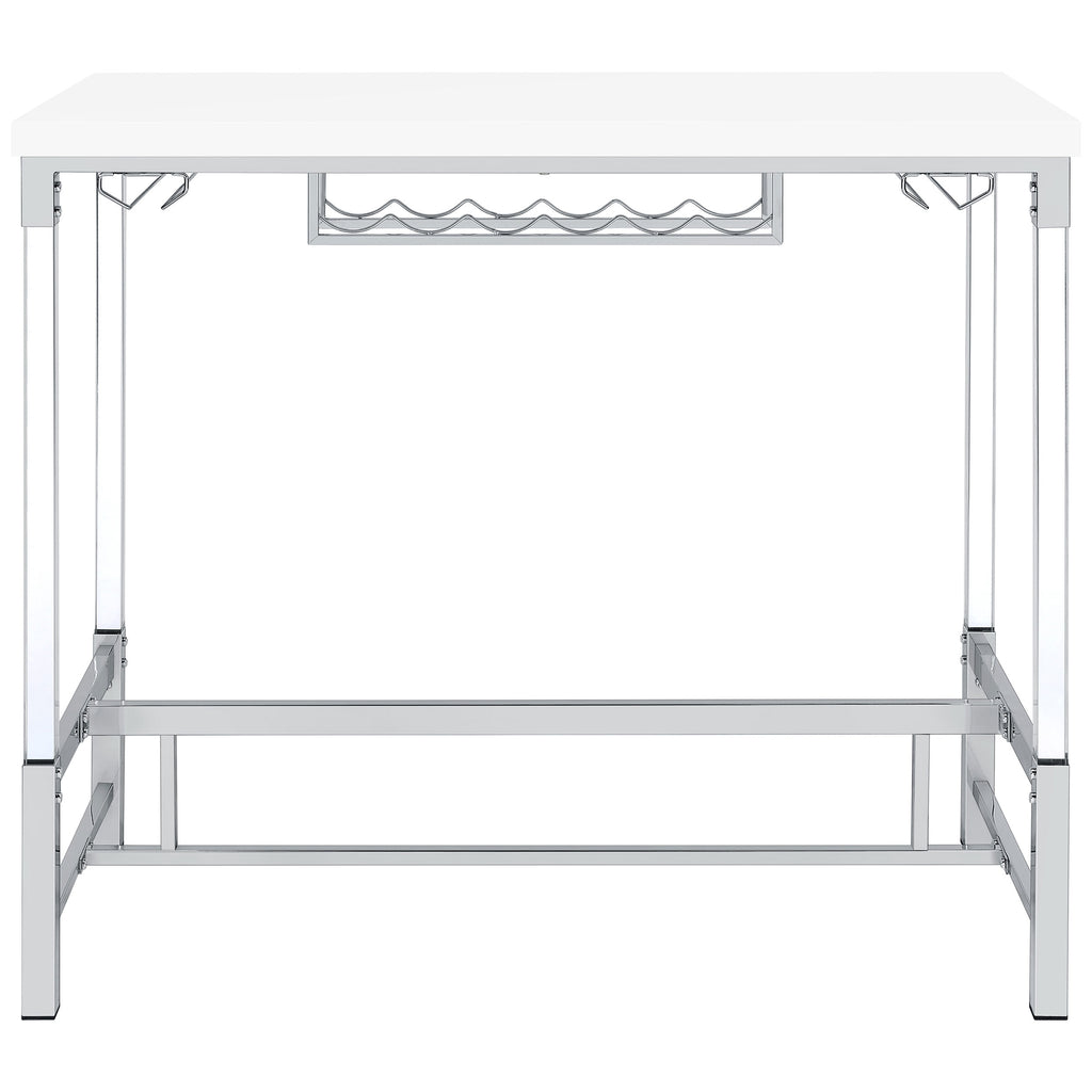 Create the ideal spot to share a bottle of wine with friends with a contemporary bar table. Perfect for two to four, it boasts a crisp, streamlined silhouette with an elevated tabletop in a bright white finish. The base features a silver finish and trestle details. Acrylic legs add a sense of light, airy ambiance, perfect for a compact nook or dining room. The table includes a built-in six-bottle wine rack and two stemware racks that make pouring a glass of your favorite vintage simple and easy.