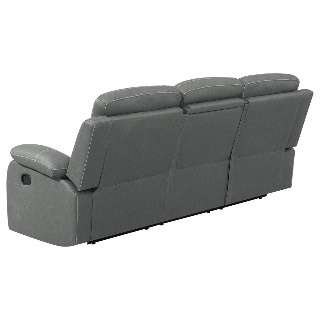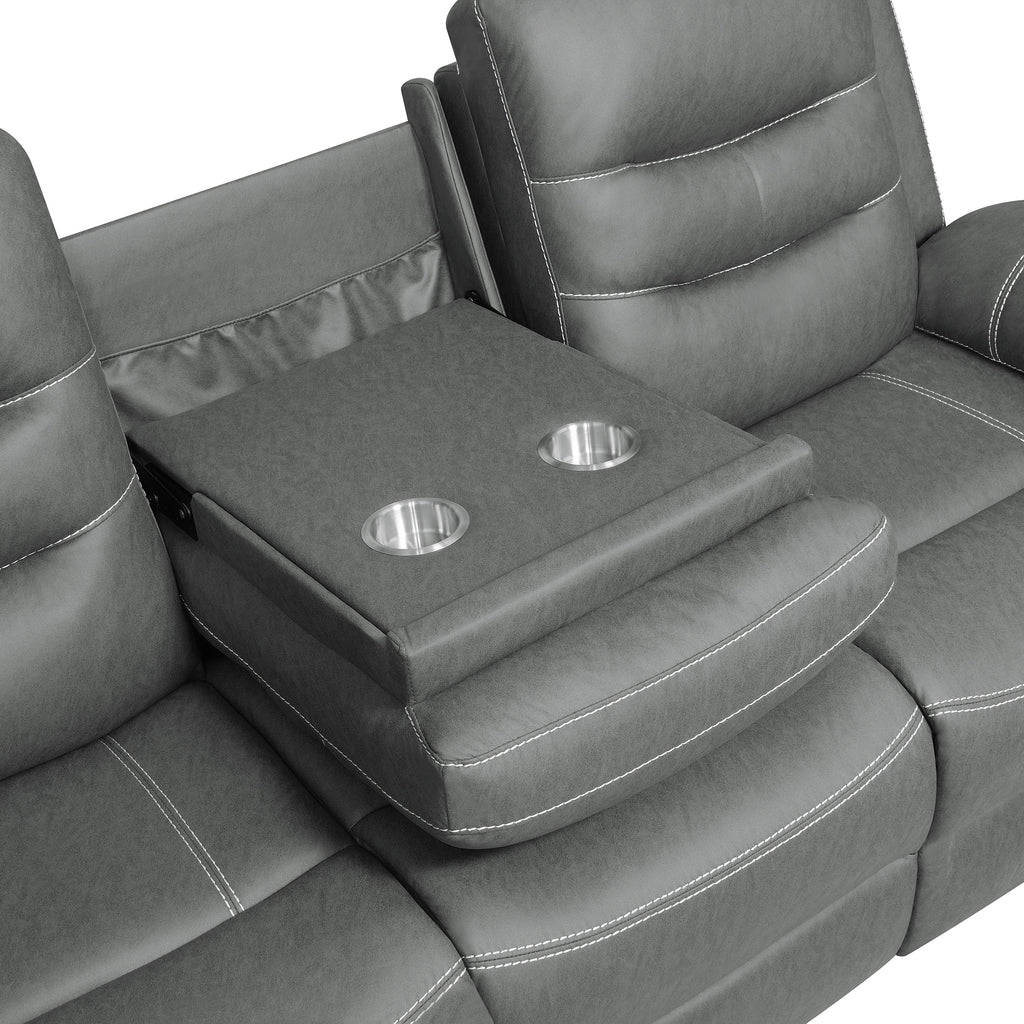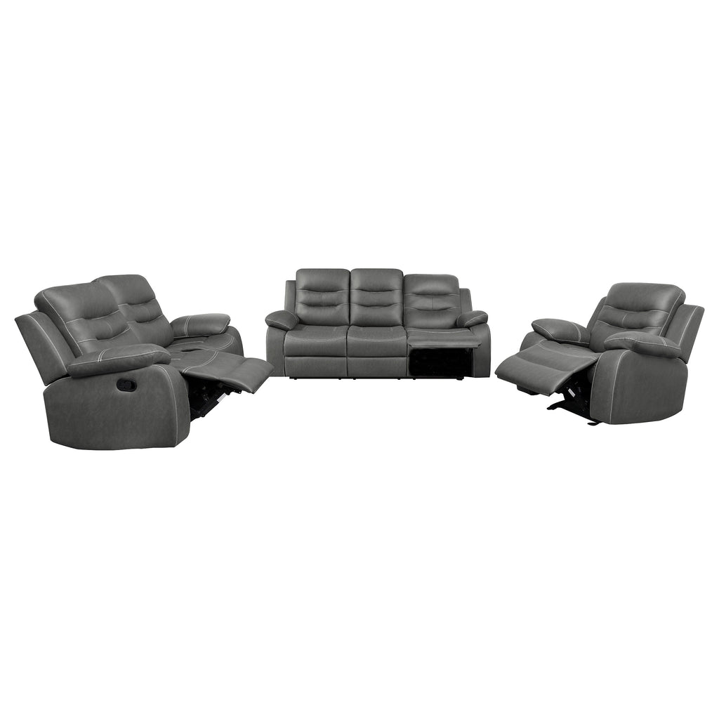 Ultra-cozy in both style and seating experience, the three-piece sofa set is ideal for entertaining or solo and family relaxation. This set includes a reclining sofa and loveseat and a glider recliner, all offering pillowy polyester fiber padding in all the right places. supporting seating comfort and a design boost through tufting and layering. Cool dark grey microfiber upholstery is pleasing and contemporary in a wood-framed set with pocket coil seating. Manual reclining creates customized positions for everything from socializing to napping, as the recliner also adds a glider function, and a wall-hugger design saves space.