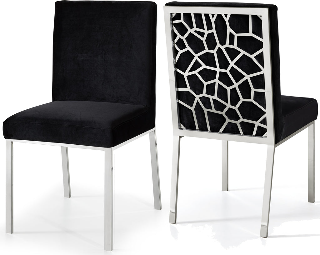 Make dinnertime a stylish affair when guests are seated in this Opal Collection black velvet dining chair from Meridian Furniture. The back of the chair features an intertwined sculptural design with a geometric motif for a modish effect that increases the wow factor in your dining space. Thick, plump seat and back cushions make sitting more comfortable, and each cushion is topped in crushed plush navy velvet for a luxurious touch and soft feel against the skin. The chair's base and back feature stainless steel construction with a chrome finish for a contemporary vibe and sturdy support.