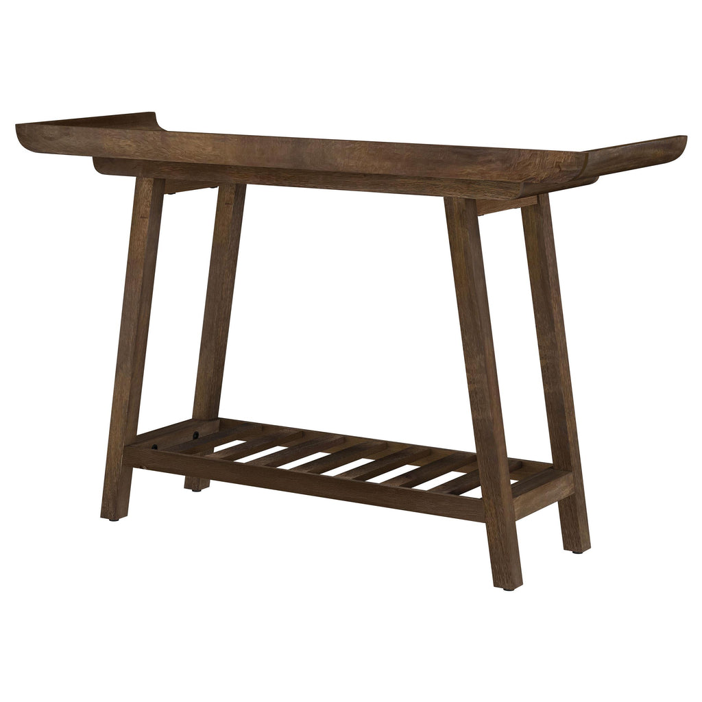 Introduce a touch of warmth and natural charm into your home with this solid mango wood console table. Its distinctive tray-style top features subtly raised edges, providing both a secure surface for décor and a practical spot to keep everyday essentials from sliding off. Below, a slatted shelf offers open storage space for baskets, books, or decorative accents. With its sturdy build, unique wood grain patterns, and versatile style, this console table easily complements various interiors.