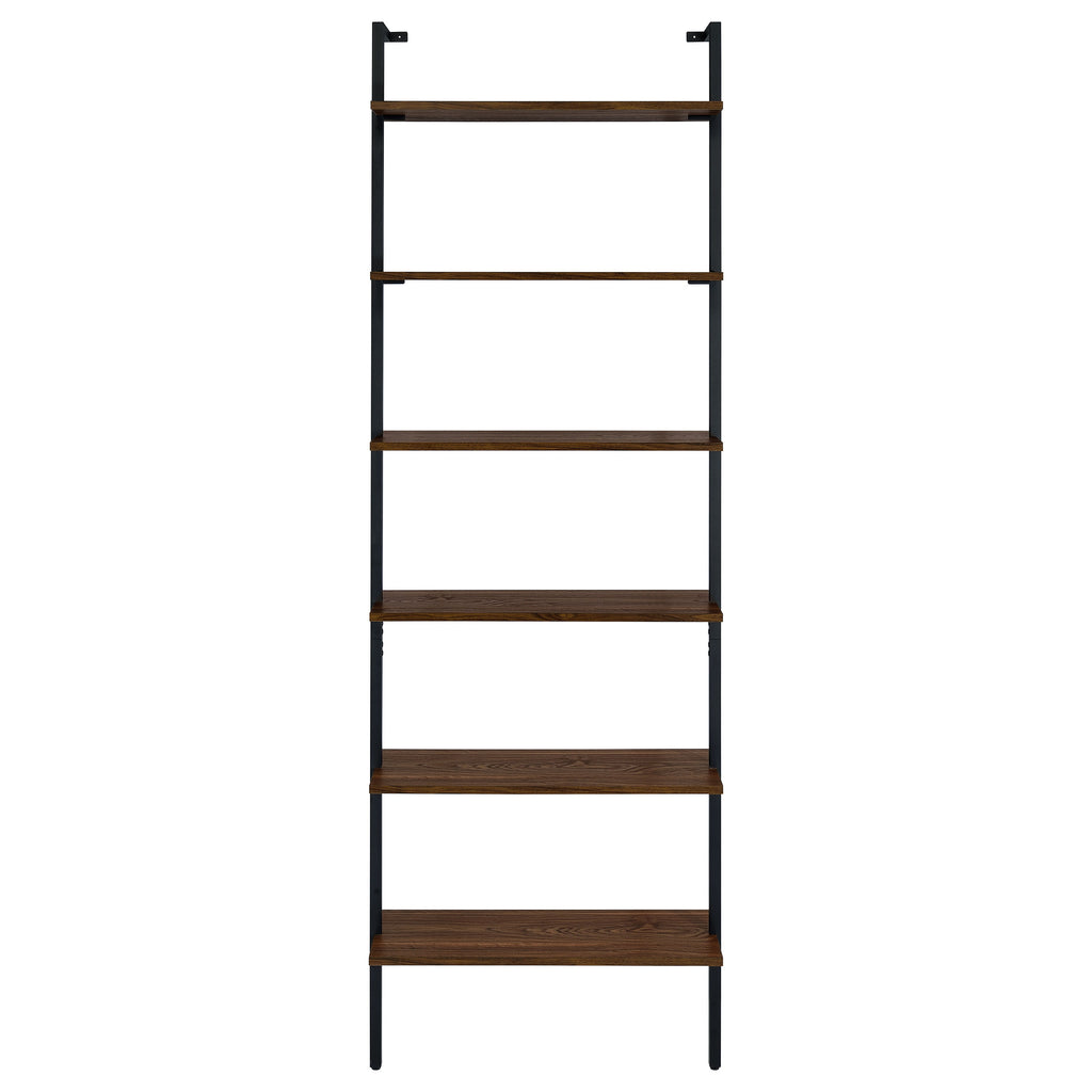 Curate your space to achieve a refined look and feel with this modern wall bookcase. Its elegant simplicity of silhouette brings light, airy ambiance in any space, maximizing space utilization without overwhelming. It features six open shelves in a walnut finish, each set within a black finish metal frame. The clean, chic lines of the frame attach to the wall at the top and drop to the floor, creating stability and minimalist appeal. Add a pair flanking your television for storage, or create a decorative vignette in a living or dining room.