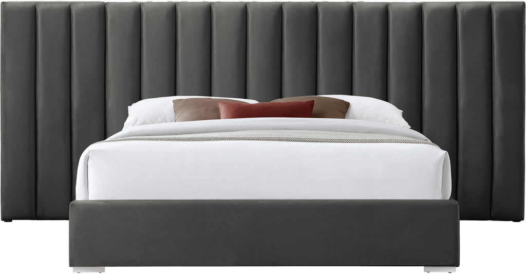 Sleep like royalty in this Pablo queen size velvet bed. This beautiful bed is destined to become the centerpiece of your bedroom sanctuary makeover with its elegantly eye-catching design and soft grey velvet upholstery. The bed rests on sturdy metal feet with a gleaming chrome finish, helping to ensure its strength and resilience for long-term use. Pair it with other items in the Pablo collection for a cohesive and coordinated look.a