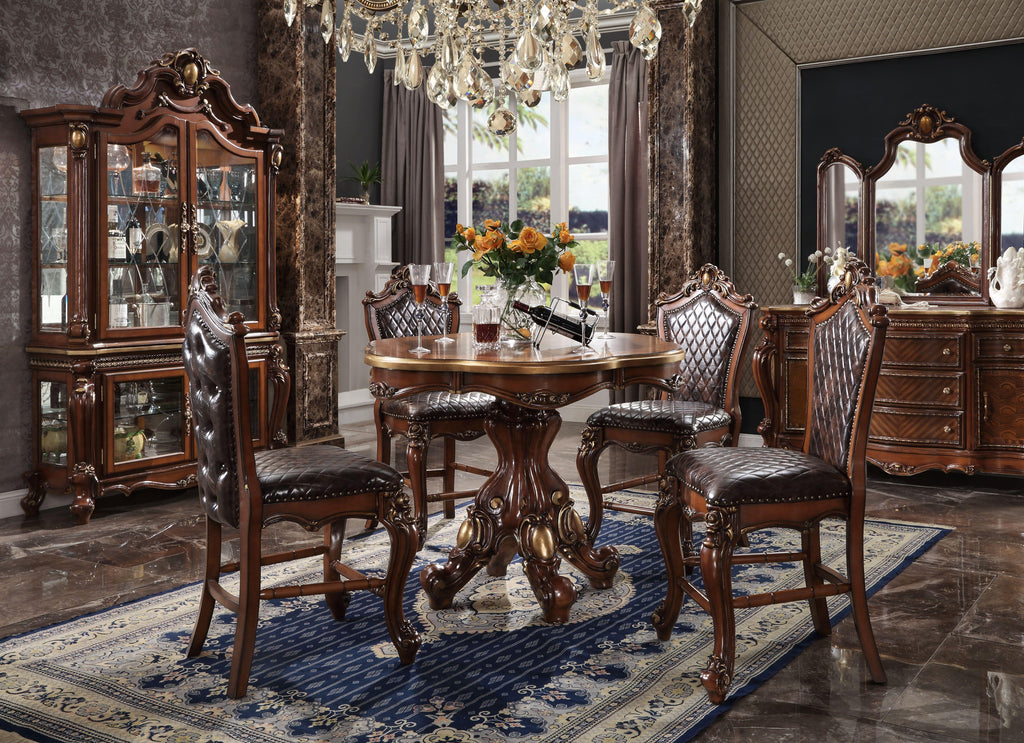 ACME Picardy Counter Height Table, Cherry Oak, 48"Dia x 37"H, 135lbs. Part of Acme-s exclusive Picardy collection, this impressive counter height dining set features a round pedestal table with spectacular antique hand-brushed accents over a rich cherry oak finish. The matching counter height chairs are upholstered in PU, and offer comfortable padded seats with nailhead trim and arched seatbacks topped with oversized crown and raised scrolled motifs. A grid pattern on in seat cushion and inner seatback, and button tufting on the outer seatback, add visual texture to enhance the luxurious appeal of the Picardy counter collection. Features: - Exclusive Design - Round Pedestal Table - Fixed Top (NO Extension) - Wooden Frame, Poly-Resin Raised Scrolled Floral Motifs, Antique Hand-Brushed Finish - Wooden Top in Cherry Oak, Apron & Single Pedestal Base in Antique Pearl Finish -- MATCHING CHAIRS: Padded Seat & Back: PU - Features, Button Tufted (Outside Backrest), Nailhead Trim - Arched Style Backrest - Queen Anne Leg - Matching Hutch-Buffet & Curio Cabinet Sold Separately (Touch Light) - Collection Picardy: Available in Cherry Oak, Bone White Finish Materials: Wood, Poly-Resin, Wood Veneer