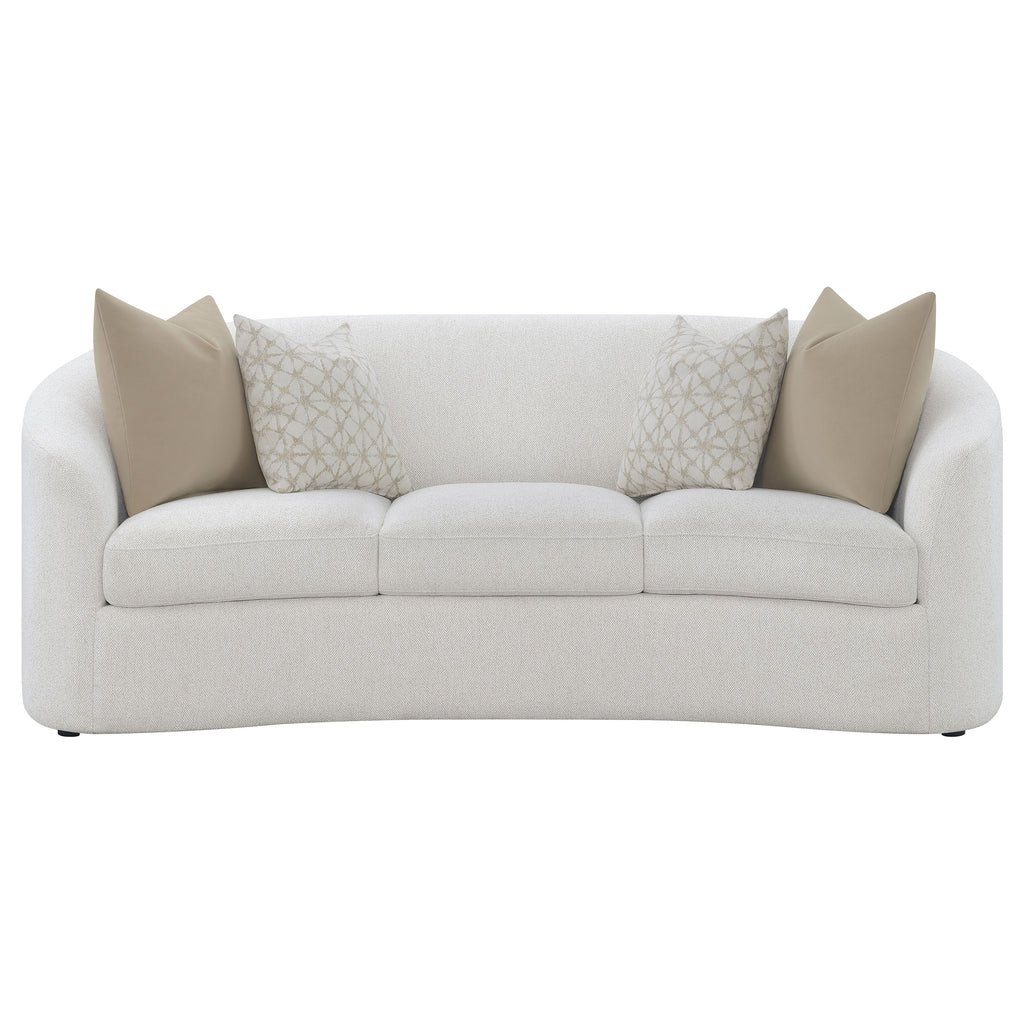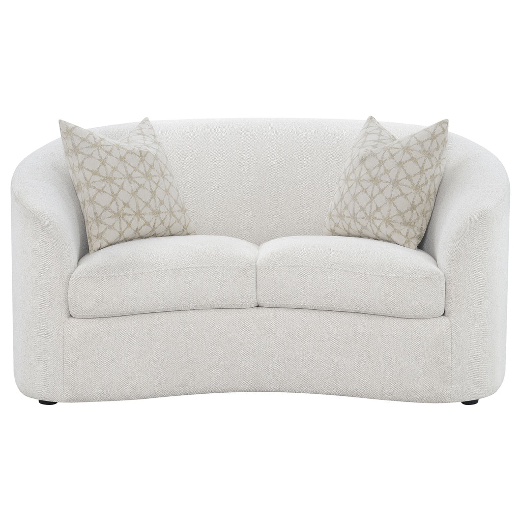 Create your modern entertaining area with this mid-century modern-inspired contemporary seating set, upholstered in a neutral latte finished boucle fabric across its elegant and curvy silhouette. Curved and sloped armrests and plush cushions keep family and visitors comfortable all through the gathering. Coordinating boucle accent pillows with premium faux down fill provide extra comfort as discreet black legs offer a bit of elevation and definition over decorative rugs.