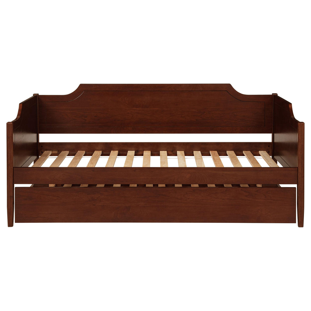 This modern classic-style daybed with trundle merges timeless elegance with practical design. The camelback silhouette and refined panel detailing add sophistication, while its construction from Asian hardwood, plywood, MDF, and cherry veneer ensures durability. The rich cherry finish highlights the natural wood grain, enhancing its classic appeal. Included slats provide reliable mattress support, and the smooth-gliding trundle with four wheels offers convenient additional sleeping space.
