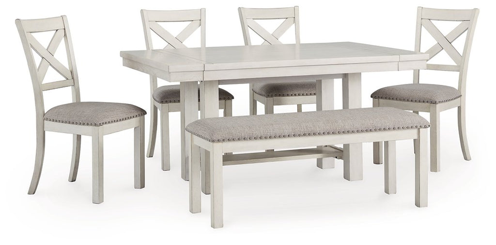 This dining package is sure to impress come mealtime. With its antiqued white finish and a planked effect tabletop, farmhouse-style dining has never been so fashionable. All that’s missing is you and your family.
