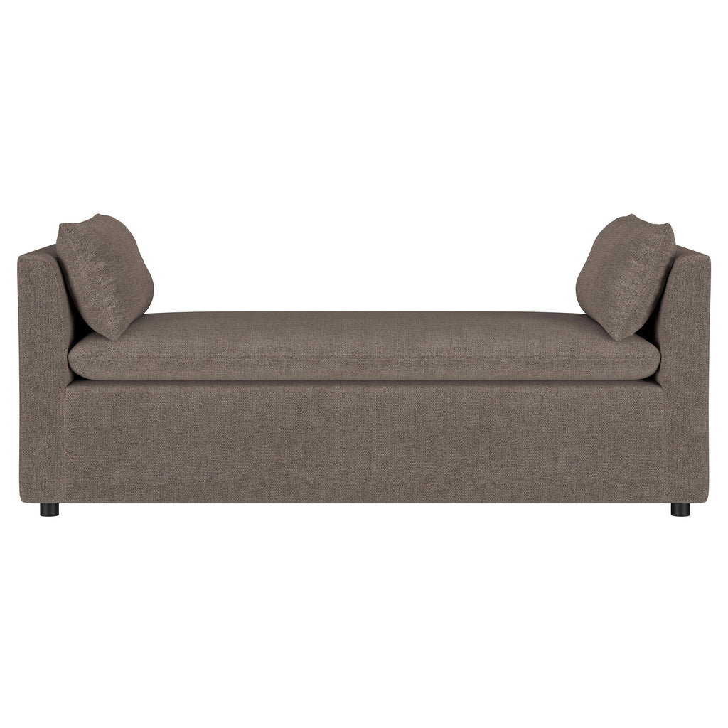 Create a chic spot for lounging or relaxing with a modern upholstered bench. With plush foam cushions and accent pillows, this backless design is ideal for a cozy primary suite or stylish living room. It features Asian hardwood framing for excellent durability, and is covered in dimensional brown upholstery. Its neutral palette is rich and refined, easily blending in myriad spaces and surrounding decors. The bench includes gently rounded arms that add a sense of structure, and a pair of accent pillows that add inviting softness.