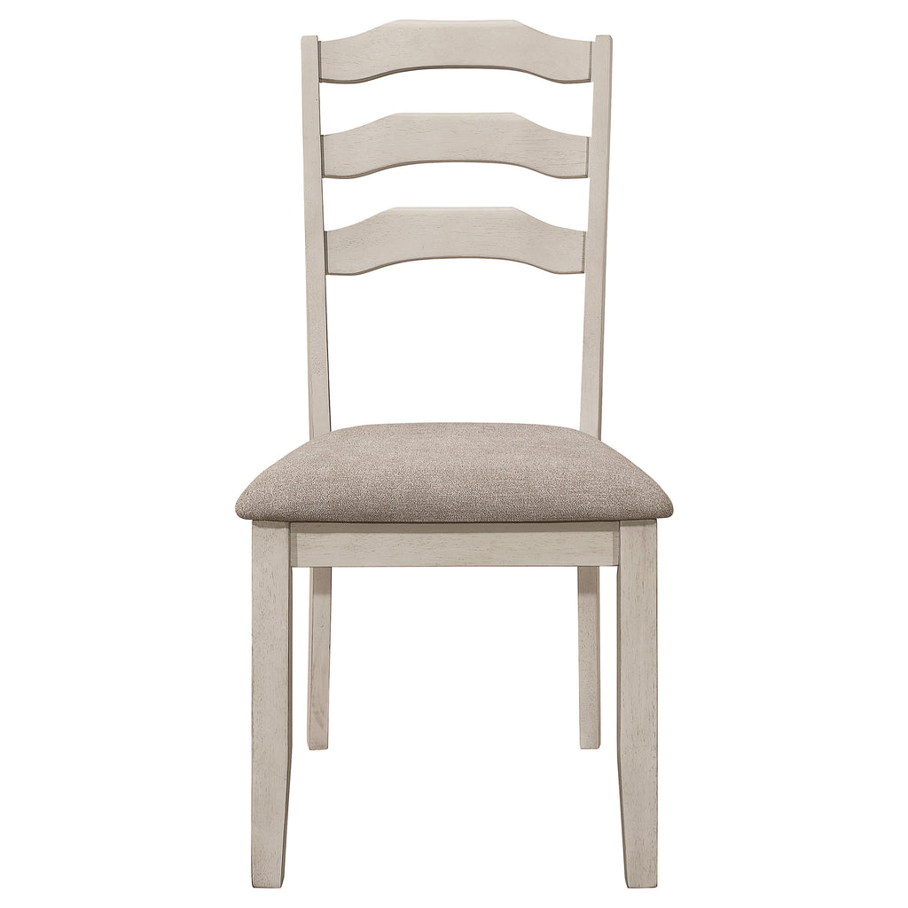 Create a cozy atmosphere with this modern farmhouse and coastal cottage dining set. The starburst design on the mindi veneer table top, supported by solid Asian hardwood legs, and rustic cream finish on the table apron and legs, add a country charm to your dining area. The ladder back chair, with its distressed cream finish on the legs and back, features a khaki polyester fabric upholstered seat for comfort.