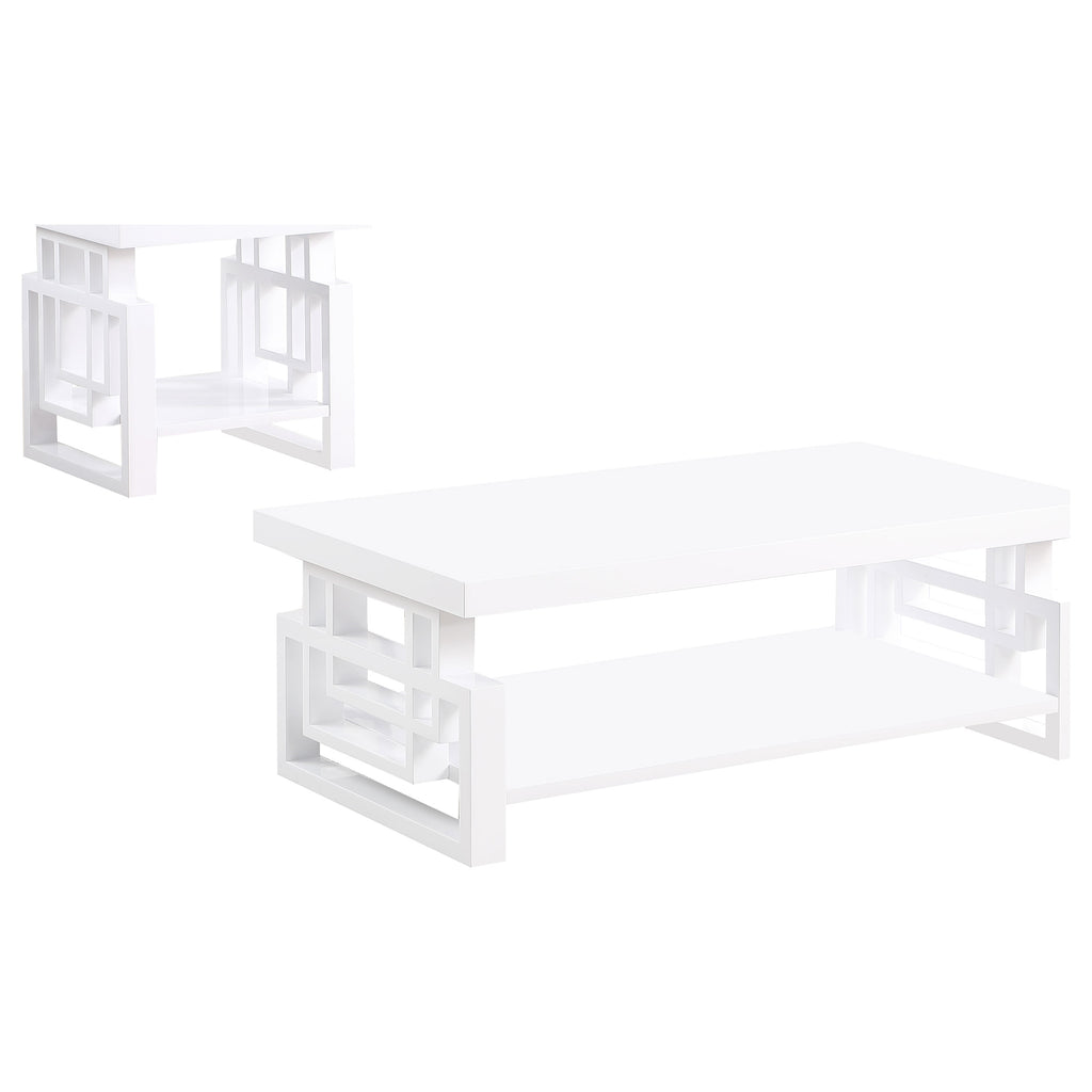 This modern coffee table set, featuring a cocktail table and a side table, blends sleek style with practical functionality. Crafted from engineered wood, both pieces showcase a striking white high-gloss finish for a polished and contemporary look. The geometric leg design adds a bold architectural flair, while open lower shelves offer practical storage. Perfect as a coffee table or end table combination, this set elevates any living room with modern sophistication.