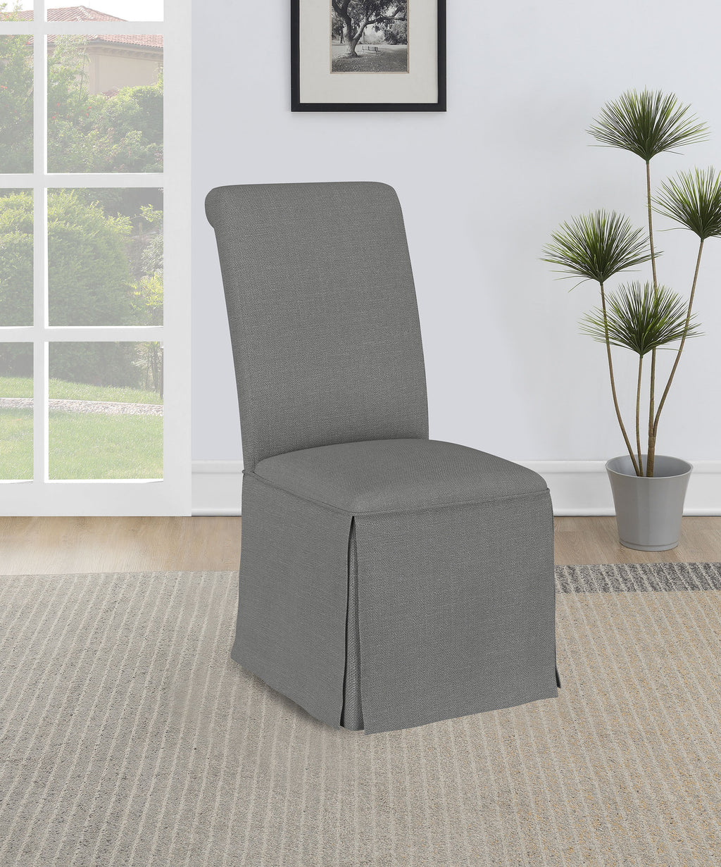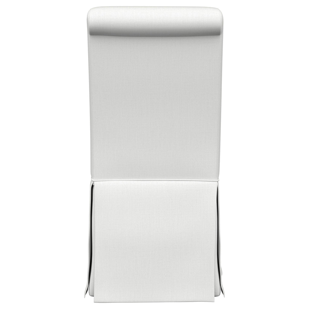 Put a stylish, somewhat formal spin on your dining room decor with a set of two classic parson chairs. Each features a tall back with an armless profile for impeccable comfort and elegance. The chair features plush foam padding, complete with neutral upholstery for a fresh, inviting presence at your dining table. The chairs showcase fully skirted silhouette, adding a touch of flowing movement. Tall, rolled backs ensure supportive seating for friends and family, wonderful for daily and occasional use.