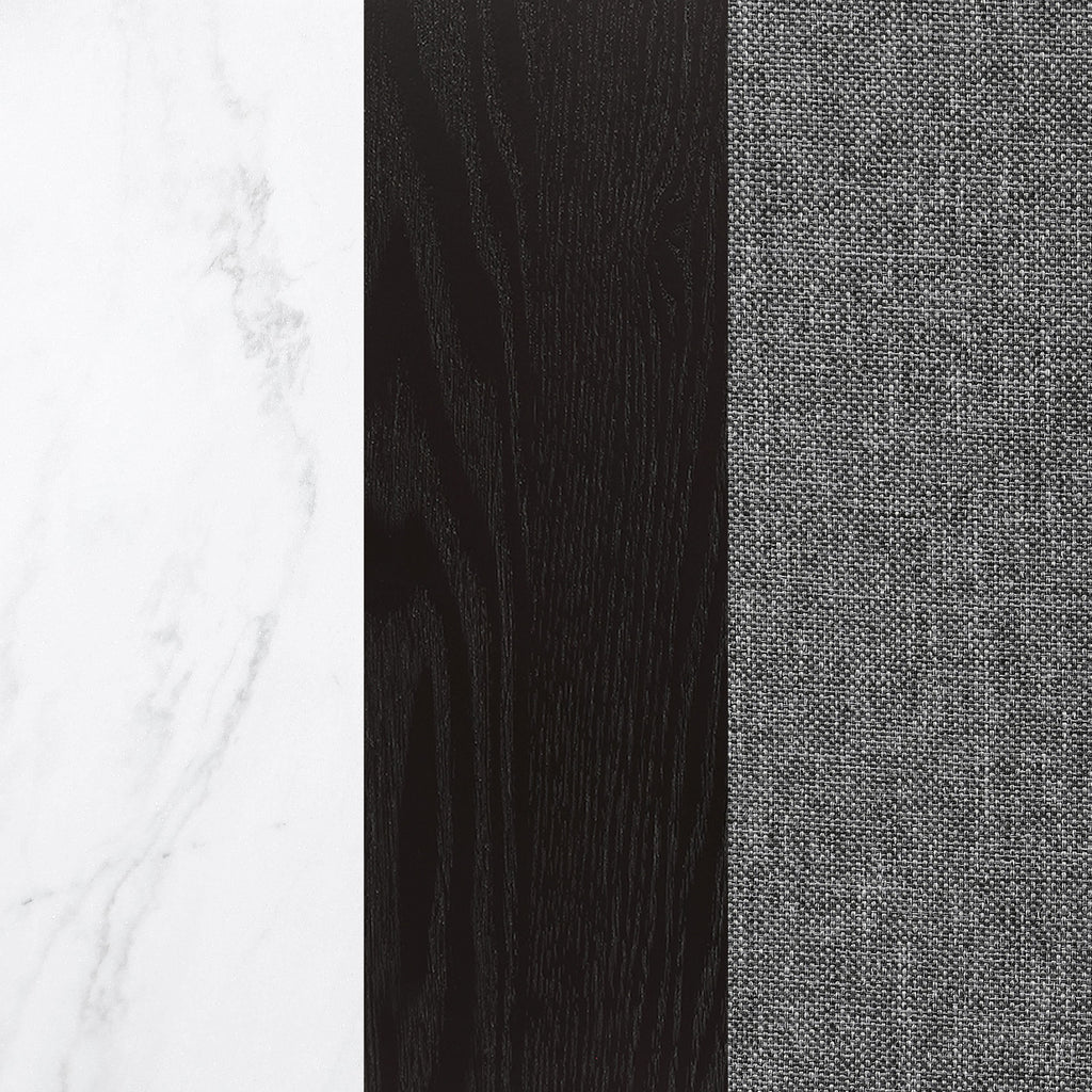 Bring together family and friends at this modern rustic style dining table set. The table features a rectangular, thick, white marble top that is spacious enough for six people. Sleek open and airy trestle base with a center punch out, rustic espresso striking color combination lends a dramatic touch and grounds the room elegantly. The set of chairs with a rolled backrest with button-tufted details lends a traditional aesthetic to a space. Also, bringing to your home the classic elements is a padded seat with individual nailhead trim that offers a charming detail.