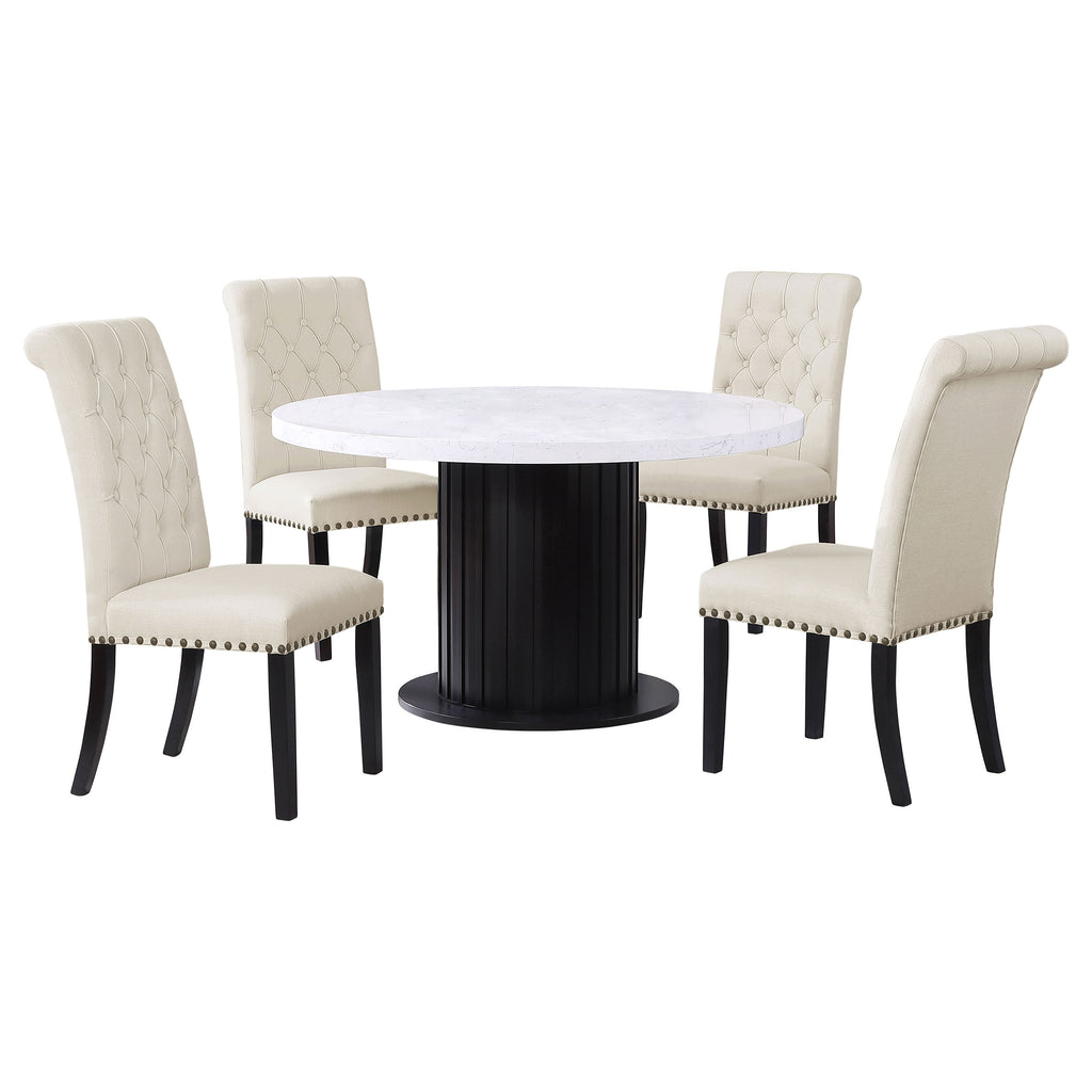 This elegant, contemporary, five-piece dining set completes formal dining experiences with a round, white, cultured marble, and rustic espresso pedestal table and four upholstered parson style side chairs. Charming details like button-tufted rolled backrests, bold nailhead trim, and flared legs lend a classical approach with modern elements.