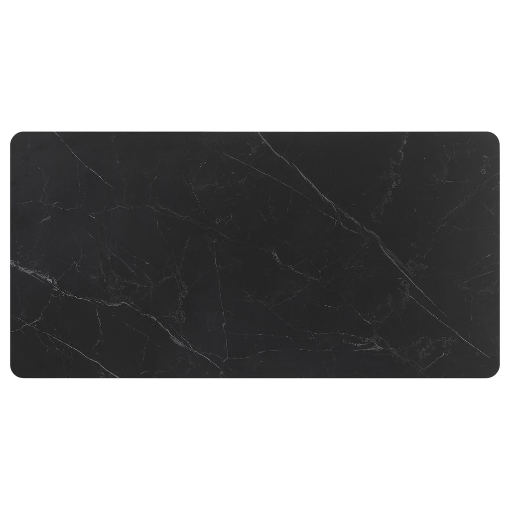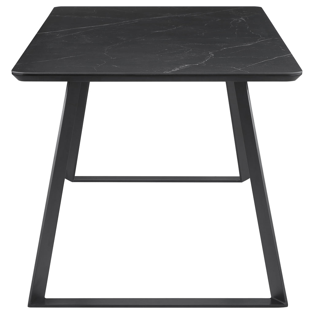 Refresh the look and feel of a modern dining room with a contemporary seven-piece dining set in black and gray. Its rectangular table features a china ceramic finish tabletop with rounded corners for an inviting look. It stands on open frame U-shaped legs that splay for added angularity. Chairs are a comfortable and inviting design, complete with dimensional gray fabric upholstery. Rounded backs offer impressive comfort, while foam cushions ensure softness and inviting ambiance in a kitchen or dining room.