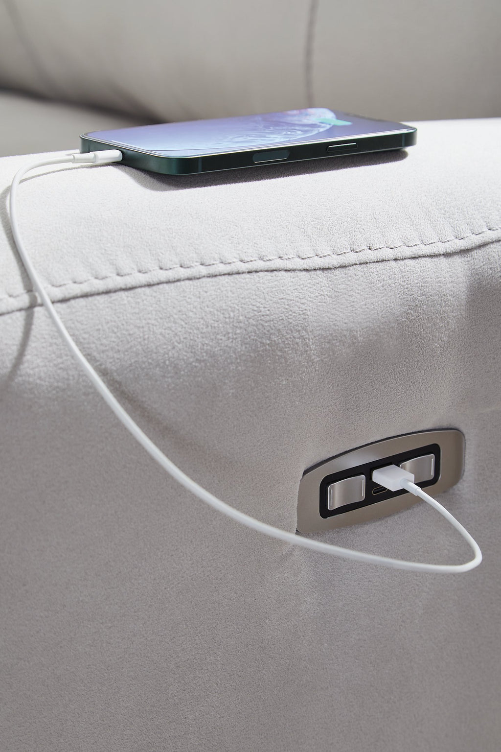 Smart, clean and ultra modern, this power reclining sectional is utterly in vogue. You'll love its indulgent cushions and contemporary bustle back styling. The sumptuous fabric, accentuated with contrasting welting, easily blends with your decor. A convenient console with storage and cup holders keeps essentials handy. And with reclining at the press of a button, this modular sectional proves chic design and superb comfort go hand in hand.