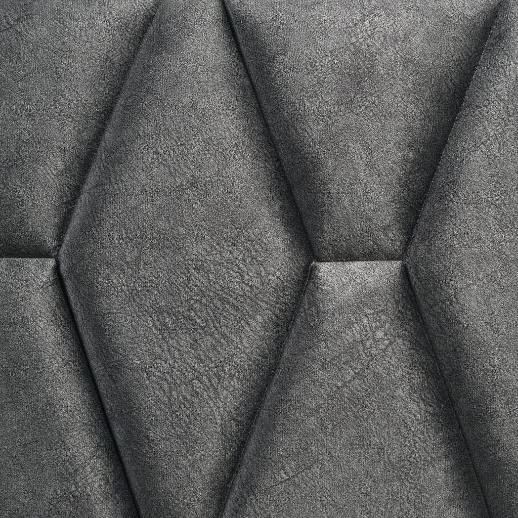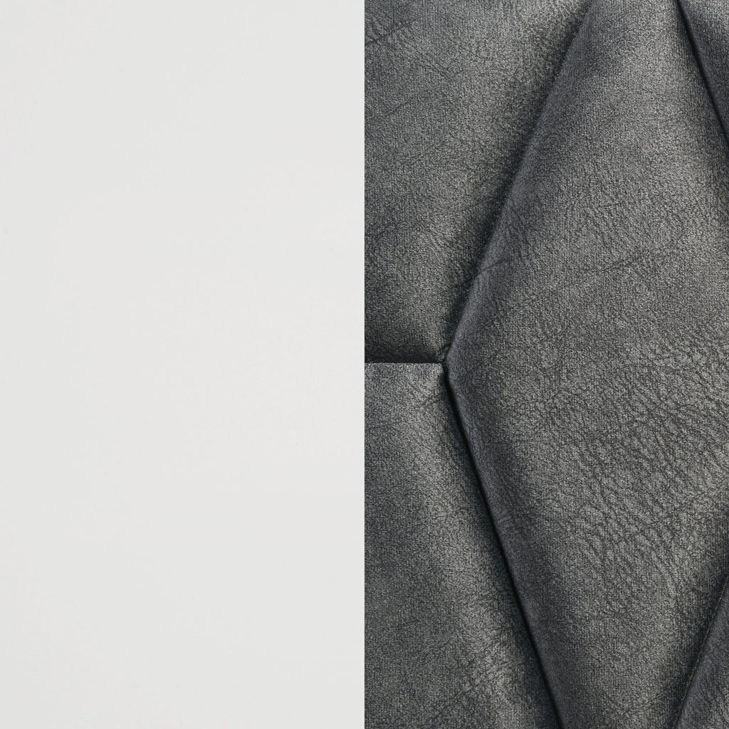 Bring geometric detail to your bedroom with the charming hexagon motif featured on this modern upholstered bed. Offering a contemporary look and feel, it creates a stylish focal point with its rich contrast of color and texture. The padded headboard offers excellent comfort and dark gray fabric upholstery. A streamlined wood frame adds a bright white finish to the rectangular head and footboards, creating an open, airy look. This stylish bed is complete with black accents in the base of the footboard and requires a foundation for use.