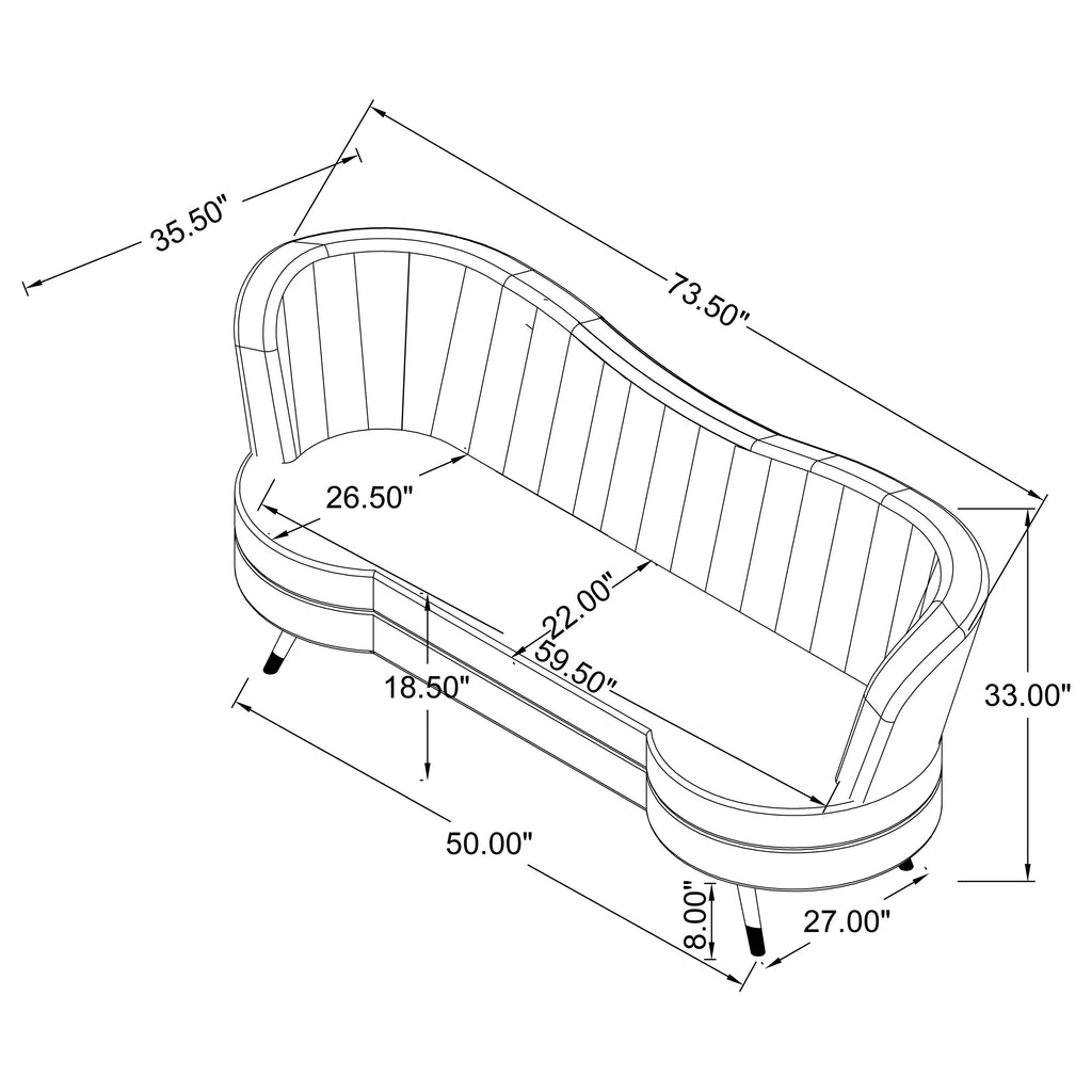 Art Deco never looked so dramatic! This retro-inspired seating set features a vivid deep blue velvet upholstery throughout, complementing by mid century modern style tapered legs in a warm gold hue. Extra details such as channel tufted interior and a vintage kidney-shaped silhouette truly make this seating ensemble one of a kind. A twist on the iconic tuxedo style, this seating group has sleek, slim track arms and an inverted camelback backrest that flows into one another. Boasting a regal aesthetic, each furniture piece offers to be a centerpiece.