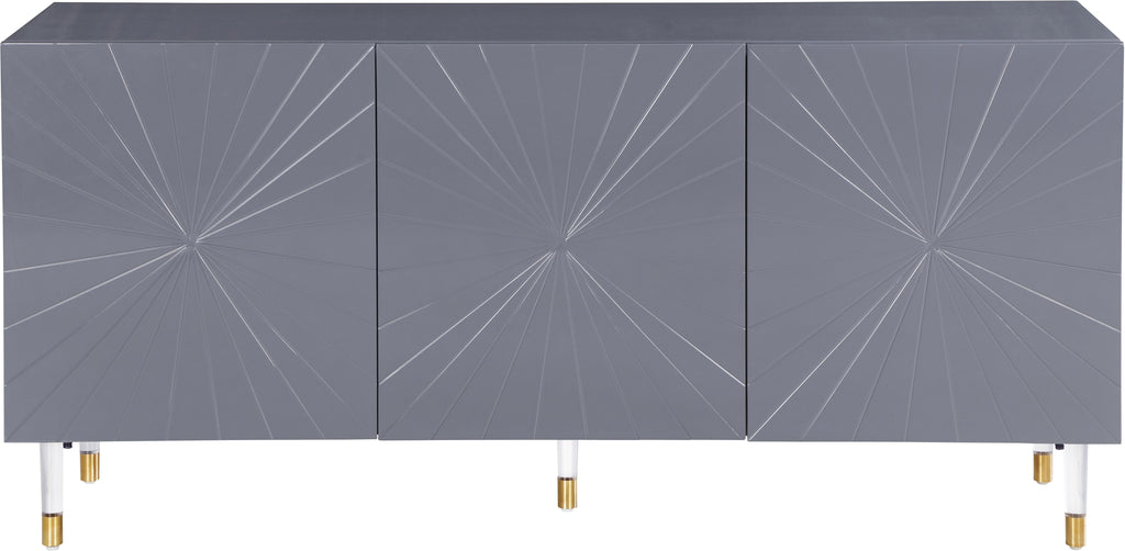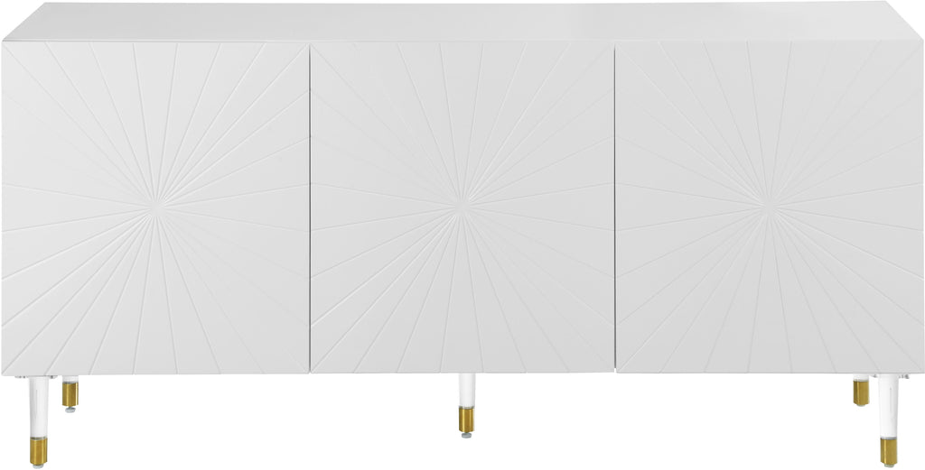 Make a bold statement in your living space with this eye-catching Florence Sideboard/Buffet from Meridian Furniture. Its white lacquer is complemented by a gold finished base, creating a contemporary design that's both modern and stylish. Four side cabinet doors open up to reveal four cubby spaces, giving you ample room to safely tuck away dishes, pots and pans, knick-knacks, books, or other household items, while the top of the sideboard/buffet doubles as shelf space for items you want on display.
