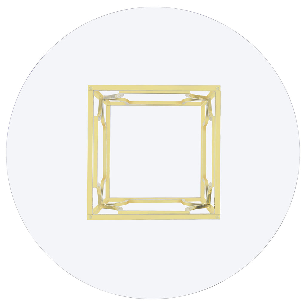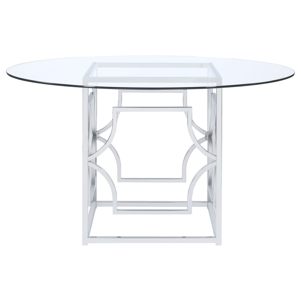 This round dining table creates a refined focal point with its clear tempered glass top and artful geometric base. The sculptural metal frame features intersecting curves and angles, electroplated in a high-shine finish for a bold, contemporary effect. Its open design keeps the space light, while the tempered glass adds a durable, easy-care surface for everyday use or entertaining.
