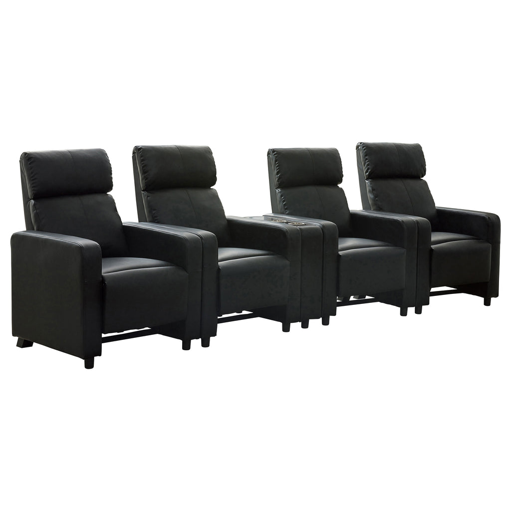 Modern home theater seats are bound to bring the movie experience to your home. Choose your custom configuration of black home theater seats, upholstered in leatherette. Slim track armrests give the chairs stylish appeal along with tufted backrests. Consider the optional consoles to go between each seat and serve as a cup holder. Choose this home theater recliner set to elevate your next home theater adventure.