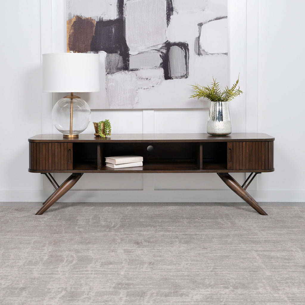 As the centerpiece of any sophisticated living room, this 71" TV stand, with its mid-century modern design, brings a touch of elegance and timeless charm. Its sleek silhouette is perfectly complemented by the rich walnut finish, offering a warm, inviting glow to your space. The cleverly designed sliding doors glide smoothly to reveal or conceal your entertainment gadgets, crafting an immaculate facade that speaks to the minimalist's soul. Designed to accommodate televisions up to 80 inches, this piece isn't just furniture—it's a statement. It stands as a testament to style and functionality, merged into one seamless creation.