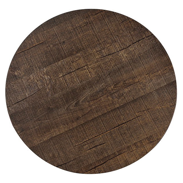 A rare find, this two-tone set showcases beautiful craftsmanship to enhance the neutral colorings. A rustic oak finish adorning the round table tops add a cozy appeal while gold finished metal legs curve elegantly to offer a lavish visual.