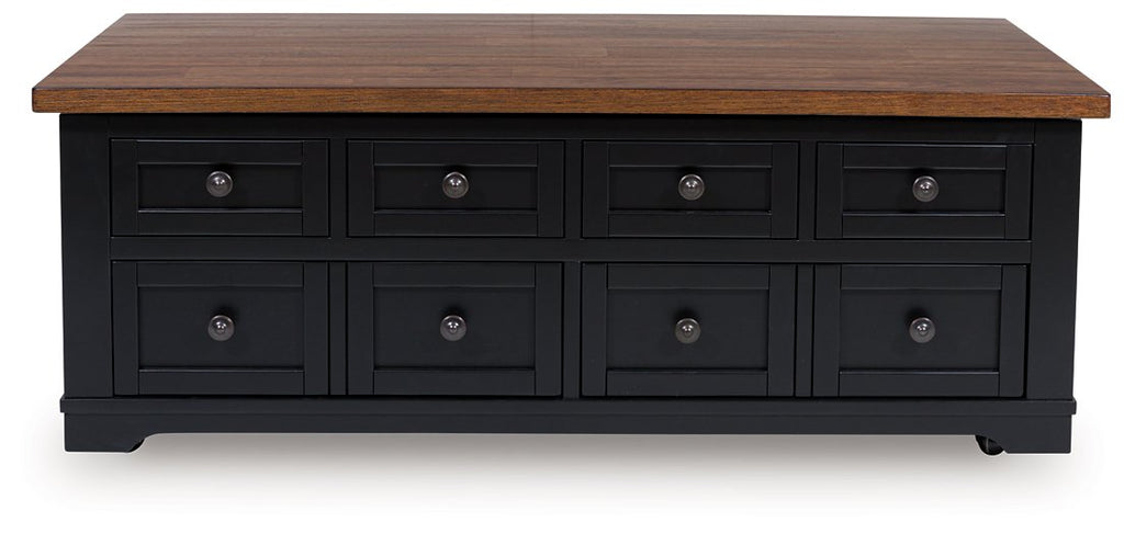 Raise the bar on modern farmhouse style with this lift-top coffee table. Its sturdy silhouette and casual good looks are accentuated with a two-tone finish, which pairs a warm satin black base with a contrasting butcher block veneer top. Combining form and function, its lift top extends for a casual dinner or extra work space in front of your sofa. Two spacious lower drawers and handy storage bins under the top make this piece awfully useful, too. Whether your style is vintage, country or eclectic, this table adds a hearty element.