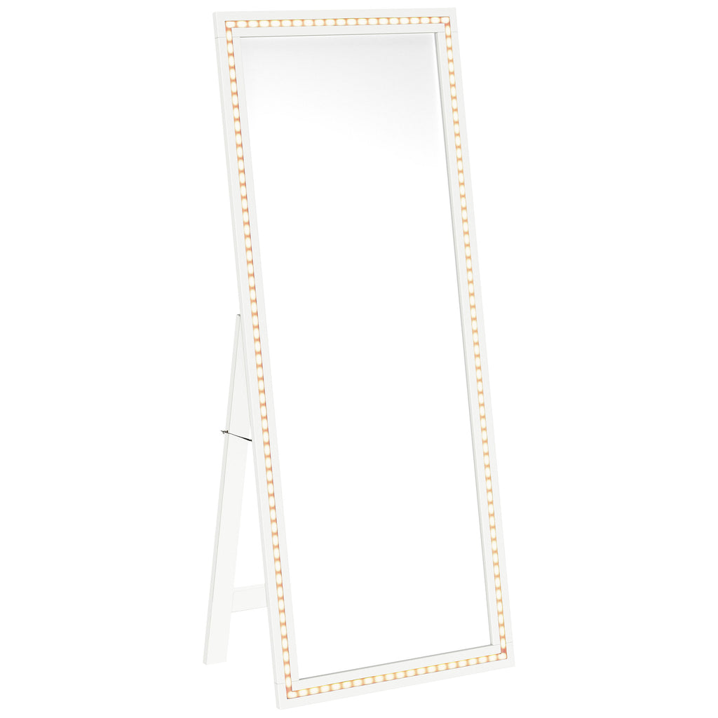 Dress up a dressing area or seating group with the glamour of a modern floor mirror. The full length design features a decorative frame complete with a support leg or its freestanding, perfect for defining an open living space or offering dimension elsewhere in your home. The mirror includes LED lighting, creating an inviting ambiance while providing light perfect for selecting jewelry or choosing your outfit. It features a neutral finish with silver trim that gleams in the light, creating a sense of depth and dimension. Choose the perfect spot for this freestanding floor mirror.