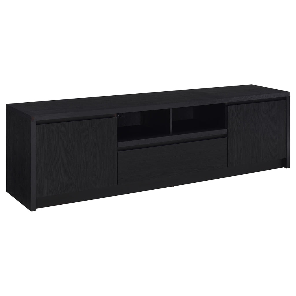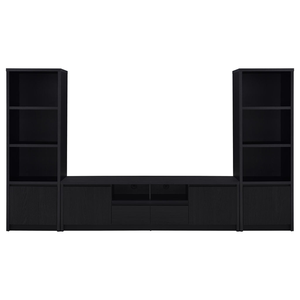 This modern entertainment center combines a sleek TV stand with two matching media towers, offering style and functionality. Finished in a bold black with a scratch-resistant eco-friendly laminate veneer, this unit provides ample storage and display options. The TV stand features cabinets, an open shelf with cable management, and a wide drawer, while each media tower includes open shelves and a bottom cabinet for organized storage. Perfect for creating a cohesive entertainment space in any living room.