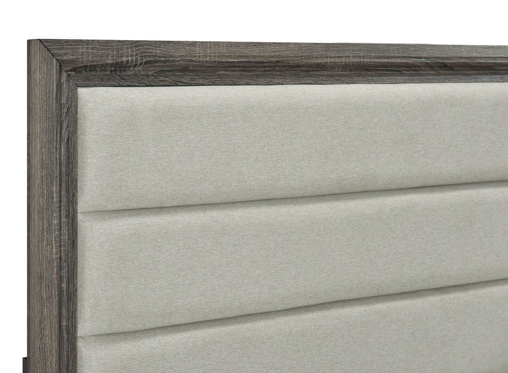Create your ideal bedroom ambiance with the fresh, casual style of this transitional bedroom set. It features engineered wood construction with durable laminate surfaces, creating a stylish look with its brown oak wood grain finish. The set is clean lined, delivering a tall, squared headboard with foam padding and tan upholstery, creating the perfect place for lounging and reclining. The bed is complete with a low footboard and rails, offering a complete look that remains open and airy, great in small and large bedrooms alike. Storage pieces add ample drawer space and roomy tops, perfect for creating organization and offering a place for a personal touch of decor.